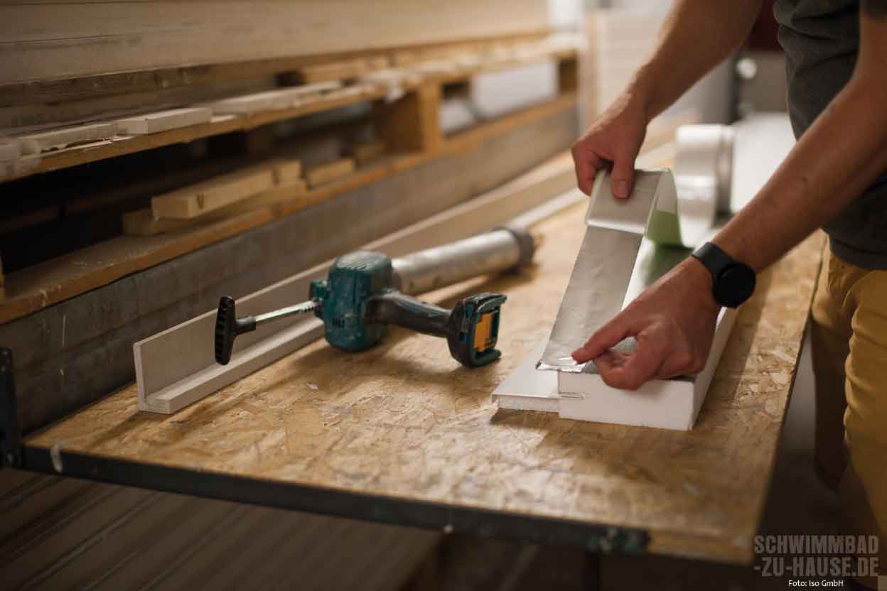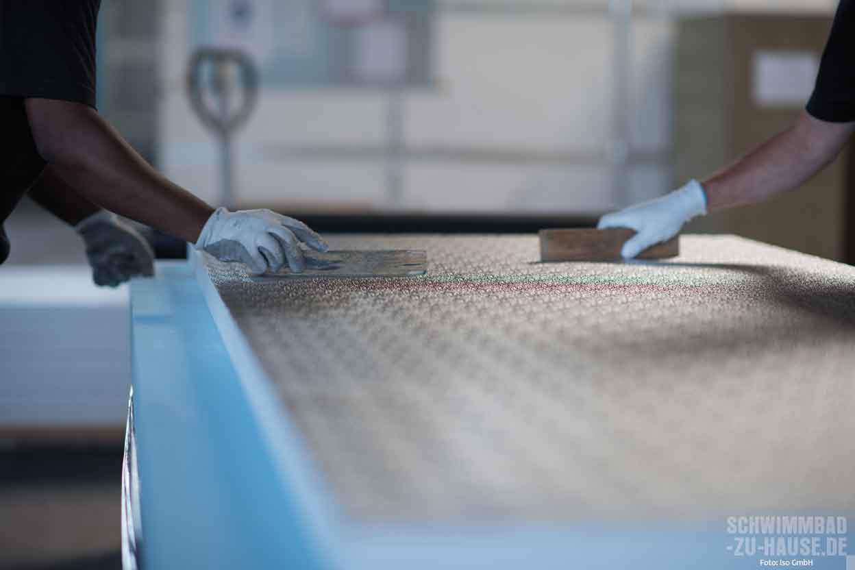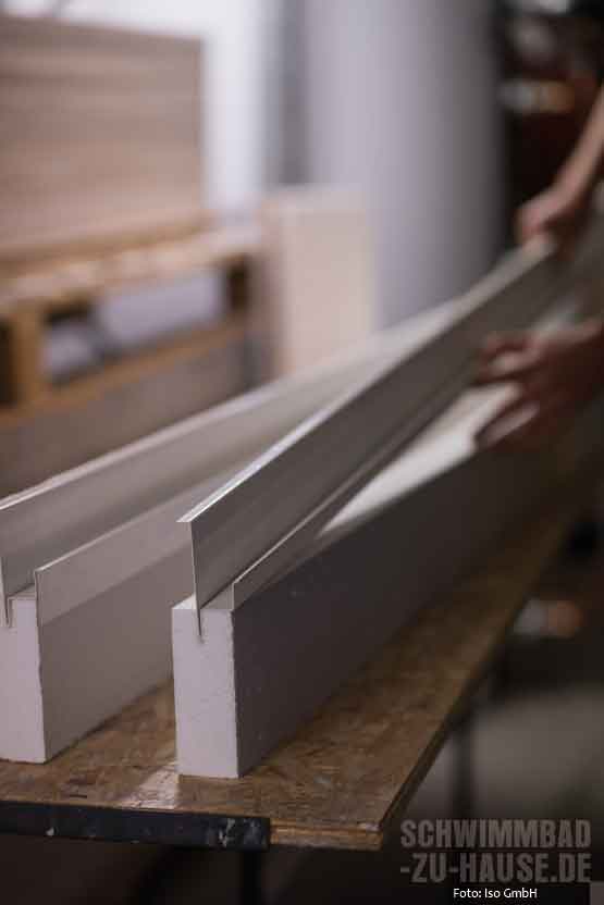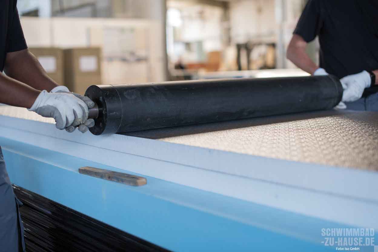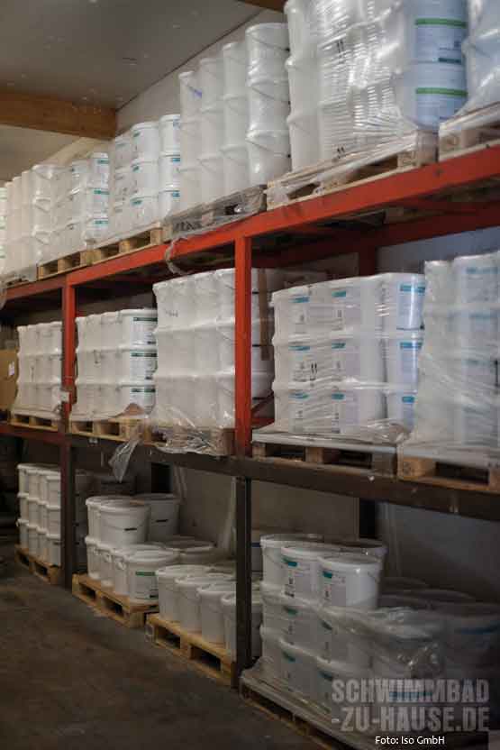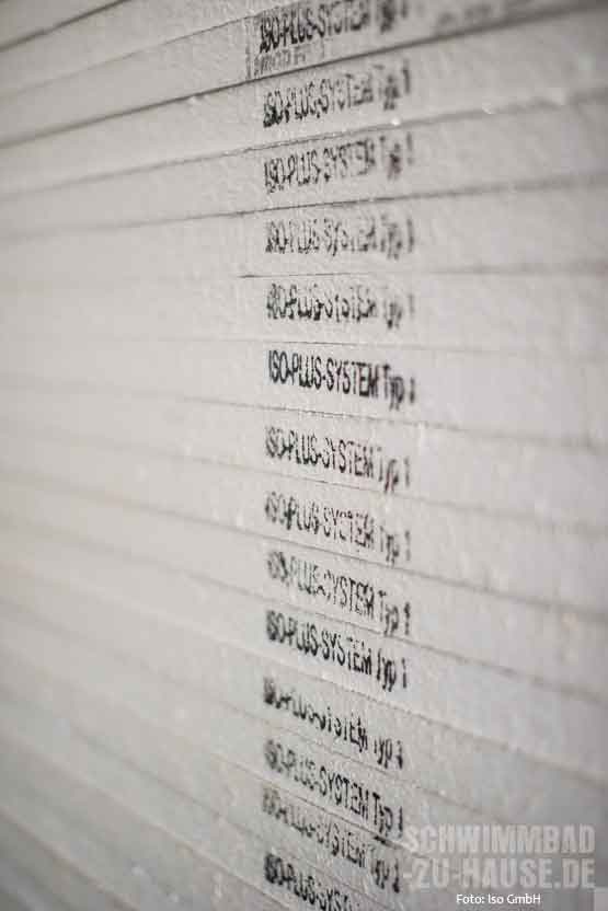 Beim direkten Produktionsprozess werden die einzelnen Styropor-Blöcke mit einem heißen Draht in unterschiedliche Dämmschichtstärken (10, 20, 30, 50, 80 und 100 Millimeter) auf Element-Größen (2,50 x 1 Meter) geschnitten. Je nach ISO-Typ trägt das geschulte Personal im nächsten Schritt den jeweiligen Kleber maschinell auf die Platte auf. Dann werden die Elemente einzeln mit der vorbereiteten Alufolie kaschiert. Die Beschichtungen werden gemäß ISO-Rezeptur gefertigt. Damit sie in einwandfreiem Zustand auf die Baustelle kommen, werden die fertigen Eimer in einem speziell klimatisierten Bereich aufbewahrt. Alle Kleber und Beschichtungen sind nach ISO-Vorgaben gefertigt und speziell für die Verwendung im Schwimmbad entwickelt und geprüft.