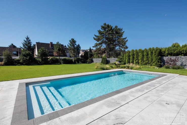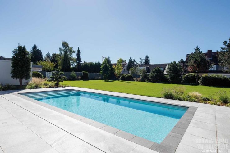 Die Empfehlung der Pool-Experten: Ein rechteckiges Einstückbecken aus glasfaserverstärktem Kunststoff, das mit seiner Länge von fast elfeinhalb Meter und seiner Breite von annähernd fünf Meter viel Platz zum Schwimmen bietet. „Bei diesen großzügigen Dimensionen ist auch ausgiebiges Bahnenschwimmen optimal möglich und es können selbst zwei Personen nebeneinander ungestört ihre Bahnen ziehen“, weiß Müller aus seiner langjährigen Erfahrung.