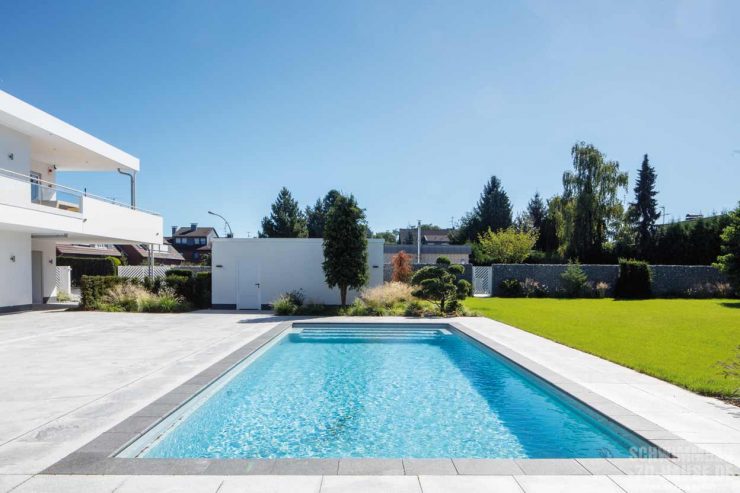 Die Bauherren hatten aber nicht nur von der Architektur ihrer zukünftigen Villa, sondern auch vom zeitgleich geplanten und gebauten Garten-Pool ganz klare Vorstellungen – im wahrsten Sinne des Wortes. „Das Becken sollte nicht nur eine reduzierte moderne Formensprache, sondern auch viel Fläche zum Schwimmen und eine seidig-glatte Oberfläche haben“, erinnert sich Horst Müller von SSF Pools by Klafs, der das Projekt für die Pool-Experten der Klafs-Unternehmensgruppe betreut hat, an die ersten Planungsgespräche zurück.