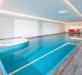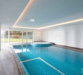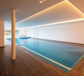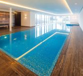 „Auch ansonsten ist dieses Projekt gespickt mit extravaganten Ideen, die das Hallenbad – wie von den Bauherren gewünscht – zu etwas ganz Besonderem machen“, fasst Rolf Petersen, der diesen Neubau bei SSF Pools by Klafs als Projektleiter betreut hat, zusammen. So sind sowohl die umlaufende Überlaufrinne als auch der gesamte Boden in der Halle mit einem matten, braunen Travertinstein belegt, den der Fliesenleger nach dem Verlegen kunstvoll von Hand verspachtelt und veredelt hat. Über dem Pool thront in einem ebenfalls mit Travertin verkleideten Podest ein Whirlpool, der mit Luftsprudel- und Massageeinrichtung zum Entspannen nach dem Schwimmtraining einlädt.