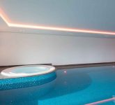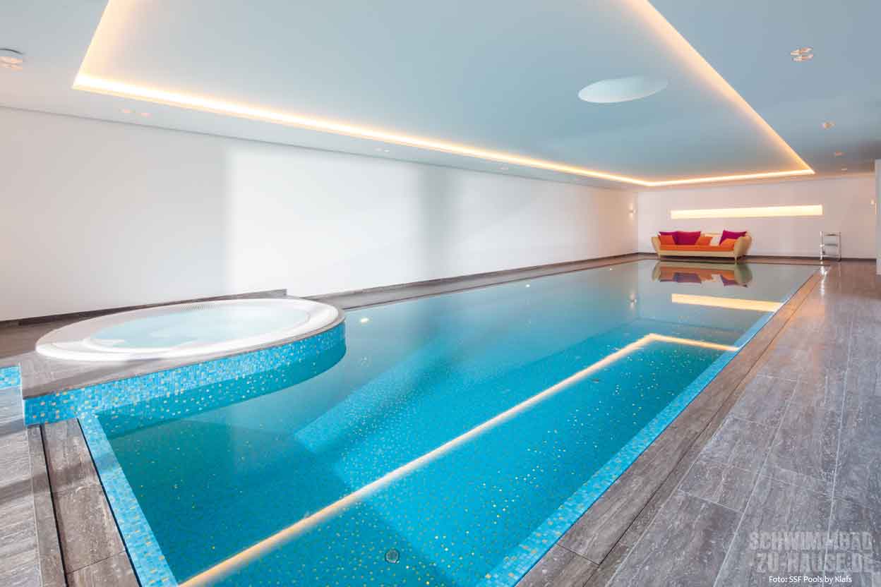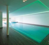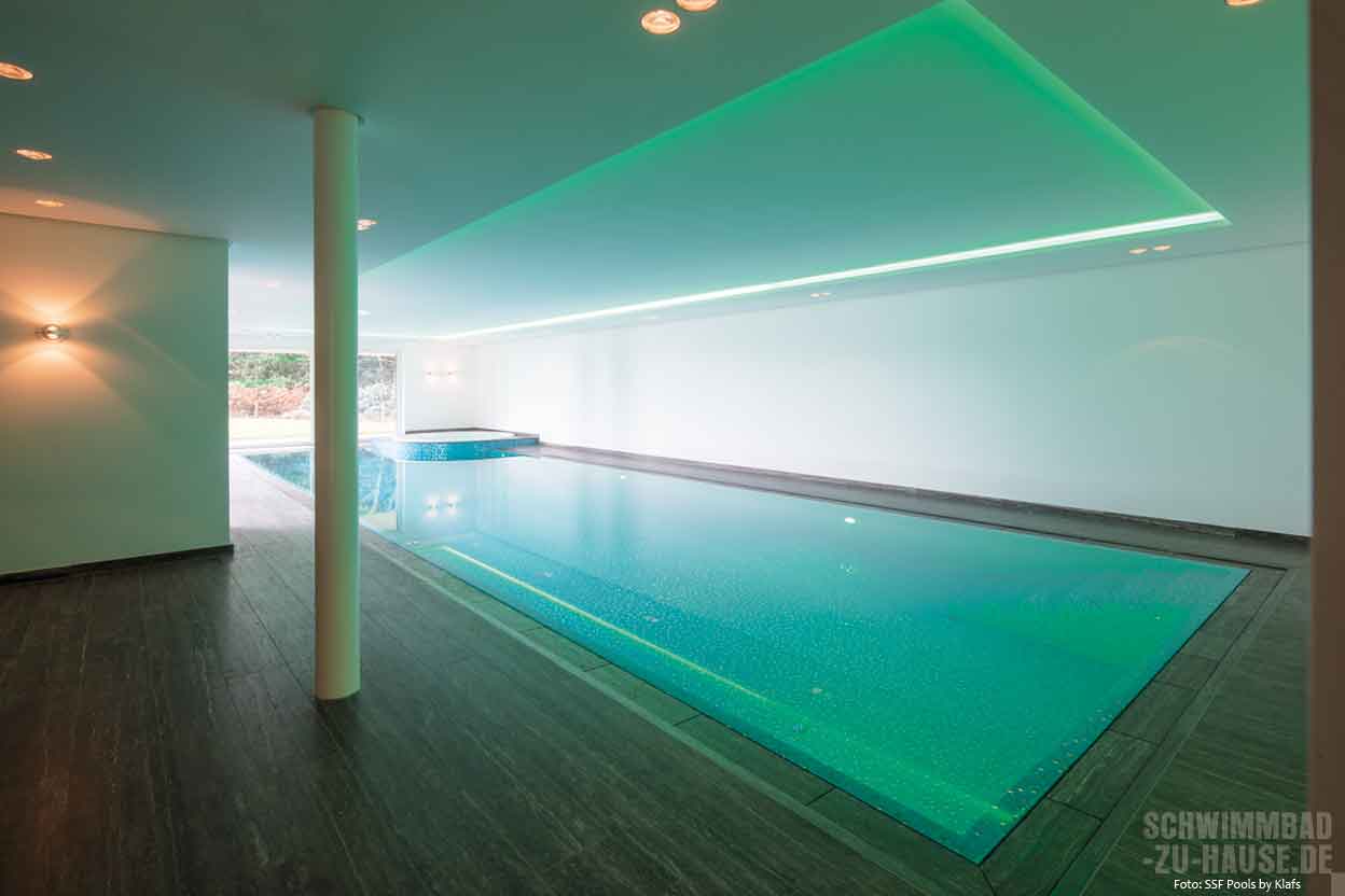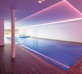 Auch die abgehängte Decke, in der eine Lichtvoute in der Form des Beckens dank moderner LED-RGB-Technik den gesamten Raum in verschiedene Farben taucht, war ein Vorschlag von SSF, der gleich angenommen wurde. Genau wie die Tatsache, dass SSF Pools by Klafs selbst bei so komplexen Projekten den gesamten Innenausbau inklusive der Isolierung, Dampfsperre und Klimatisierung mit hoch energieeffizienter Wärmerückgewinnung aus einer Hand anbietet. „Nicht zu vergessen unsere Kompetenz in Sachen Sauna und Dampfbad, die wir dank Zugehörigkeit zur Klafs-Gruppe haben“, betont Petersen.
