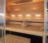 So bietet die Sauna bei diesem Projekt reichlich Abwechslung – dank der einzigartigen, patentierten „Sanarium“-Funktion für fünf unterschiedliche Badeformen: klassische Sauna, Warmluftbad, Tropenbad, Aromabad und Softdampfbad. Auch beim Design ist sie etwas ganz Besonderes: Die für ihr einzigartiges Gestaltungskonzept mit geradlinig geschichtetem Innenraum durch feine, exakt verarbeitete Stäbe aus hochwertigem Hemlockholz mit dem renommierten „iF Product Design Award“ ausgezeichnete „Pure“ von Klafs begeistert mit einer puren, reduzierten Atmosphäre. Die durchgehende Glasfront erlaubt den Bauherren beim Saunabaden ungestörte Ausblicke, die Liege wirkt dank Edelstahlfuß, als würde sie im Raum schweben. Die indirekte Beleuchtung „Sunset“ taucht die Kabine zudem in ein herrlich warmes,