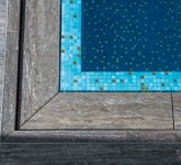 Stattliche 14 Meter lang und vier Meter breit – schon die Abmessungen des Pools sind bei diesem faszinierenden Neubau-Projekt alles andere als alltäglich. Und ein Hart-PVC-Becken, ohnehin bereits oberste Liga, was Qualität und Langlebigkeit betrifft, auch noch mit edlen Glasmosaikfliesen auskleiden zu lassen, zeigt den hohen Anspruch der Bauherren. Doch damit nicht genug: In diesem Pool funkeln die Glasmosaikfliesen ganz besonders verführerisch, denn immerhin zehn Prozent der Fliesen sind echte Goldfliesen. Die Innenarchitektur betont klar, ruhig und modern, was einen reizvollen Kontrast ergibt. Ganz nach dem Motto: Gegensätze ziehen sich an.