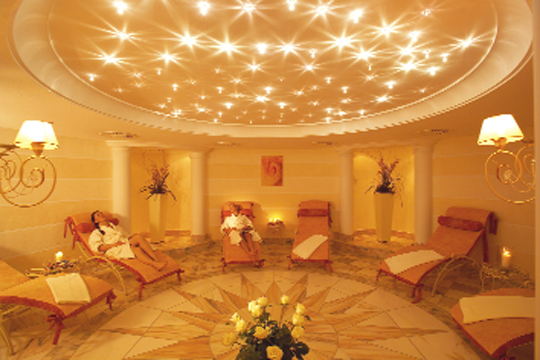 Der Spabereich verspricht mit Panoramahallenbad, beheiztem Außen-Schwimmbad, Dampfbädern, Sauna, Sanarium, Thermarium, Kneipp­anlage sowie einer Ruhelandschaft mit offenem Kamin umfassende Erholung im romantischen Flair. Zwei Whirlpools sorgen für angenehmes Prickeln: einer im Hallenbad, der andere im Freien. Doch nicht nur die Vielfalt an Wellnesselementen lässt sich ge­meinsam mit dem Partner erkunden – auch im Beautybereich ist für Paare einiges geboten. So können etwa verschiedenste Bäder in trauter Zweisamkeit noch mehr Vergnügen bereiten. Das Schrunser Heubadl ist sicherlich das Außergewöhnlichste – statt von Wasser ist man von feinsten Gräsern, Blüten und Kräutern umgeben. Die Rosenblüten-, Cleopatra- und Algenbäder – um nur einige zu nennen – genießt man wieder im bekannten nassen Ele­ment. Massagen und Problemzonenbehandlungen runden das Programm ab. Etwas exotischer wird es dann bei den Ayurveda-Behandlungen, die nach indischem Vorbild, jedoch auf die Be­dürfnisse der westlichen Haut abgestimmt durchgeführt werden.