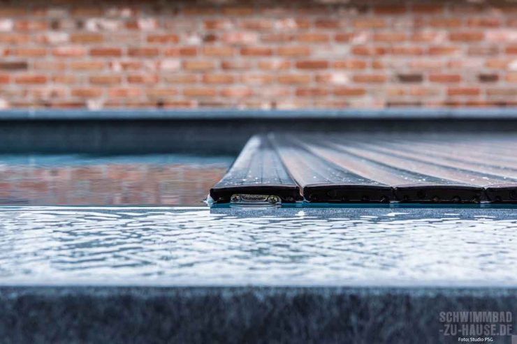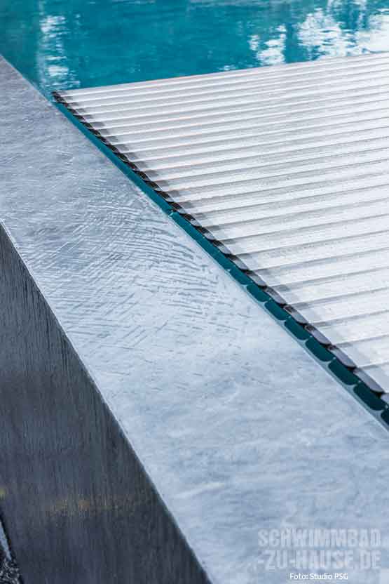 Wer lieber im Wasser sonnt, der kann sich auf der Flachwassersitzbank an der Stirnseite des Beckens niederlassen. Die Sitzbank hat allerdings noch eine weitere Funktion: Sie ist der Rollladenschacht für die in den Beckenkörper integrierte Abdeckung. „Da die Bauherren von einem besonders energieefizienten Pool träumten, installierten wir eine Abdeckung mit Solarlamellen aus Polycarbonat von der Firma Technics & Apllications aus Belgien“, erläutert Laurent van Puyvelde. Diese fährt bei Nichtbenutzung des Schwimmbads automatisch über das Wasser und verhindert sowohl Wärmeverluste als auch Verschmutzungen des Badewassers. Der Solareffekt entlastet hierbei die Wärmepumpe, die das Wasser heizt. Gemeinsam mit weiteren zuverlässigen Produkten wie Pumpe und Filter- sowie Dosieranlage konzipierte man so ein Poolprojekt, um dessen Betrieb sich die Familie in der Regel nicht allzu viel kümmern muss – lediglich den Poolroboter muss der Bauherr von Zeit zu Zeit zu Wasser lassen. Très bien!