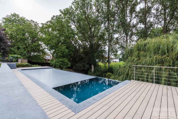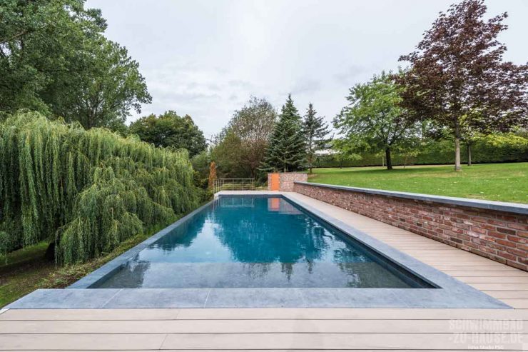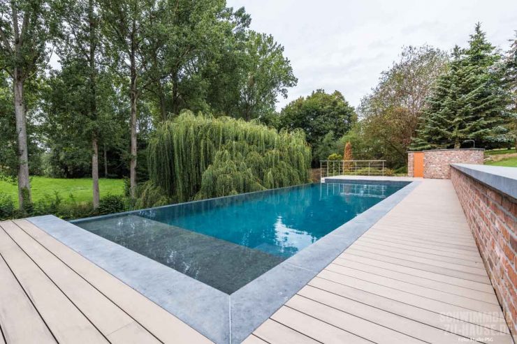 Hat man einmal einen Pool besessen, möchte man ihn nie mehr missen. Einmal Haus mit Pool, immer Haus mit Pool. Und so war der Bau eines eigenen Freibades bereits beschlossene Sache, als die Familie aus dem belgischen Thuillies jüngst das neue Haus mit fantastischem Garten erwarb. Das Grundstück war geradezu prädestiniert für ein Becken mit Überlauf. Das entstandene Schwimmbad übertrifft jegliche Erwartungen. Hier, in ihrer eigenen Ruheoase, können die Bauherren den Alltag vergessen, entspannen und ihren Gedanken freien Lauf lassen.