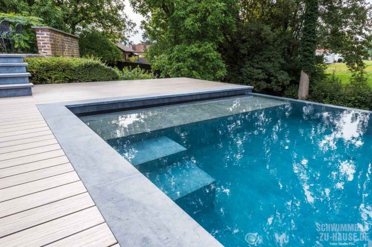 Damit das Badewasser möglichst natürlich und dennoch edel strahlt, entschied sich der Poolprofi für die Schwimmbadfolie „Alkorplan Touch Elegance“ von Renolit. So ergibt sich ein optisch beeindruckender Kontrast zu der hellgrauen Beckenumrandung aus großformatigen Natursteinfliesen. Diese wiederum sind von einer Holzterrasse eingefasst. Hier ist ausreichend Platz für die ganze Familie, um sich nach dem Baden von der Sonne trocknen zu lassen. Das gesamte Ensemble aus Wasseroberfläche, Umrandung und Terrasse befindet sich auf gleicher Höhe, sodass der Eindruck entsteht, alles sei aus einem Guss.