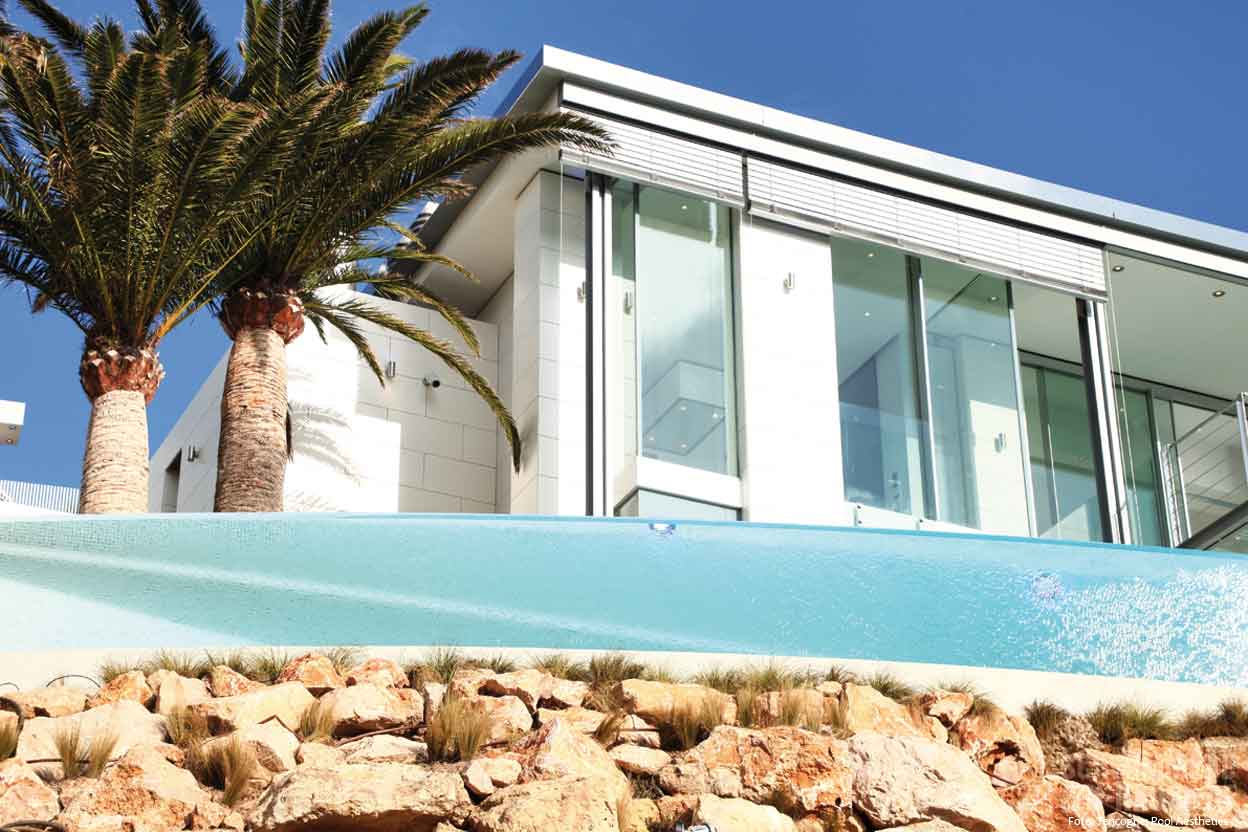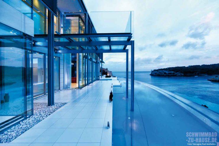 Durch einen atemberaubenden, halbrunden Pool mit einzigartiger Infinity-Wirkung besticht dieses Objekt. Zu Beginn sollte das majestätische Haus an der Küste Mallorcas lediglich um einen Outdoor-Pool ergänzt werden. Doch während der Planung kristallisierte sich heraus: Ein „gängiges“ Schwimmbecken kam für das Ehepaar mit zwei Kindern nicht in Frage. Jetzt bildet die 33 Meter lange blaue Wellness-Oase den krönenden Abschluss des südländischen Traums. Der Pool schmiegt sich dank perfekter Facharbeit der Profis mit seiner runden Acrylglasscheibe geschmackvoll an die Villa an.