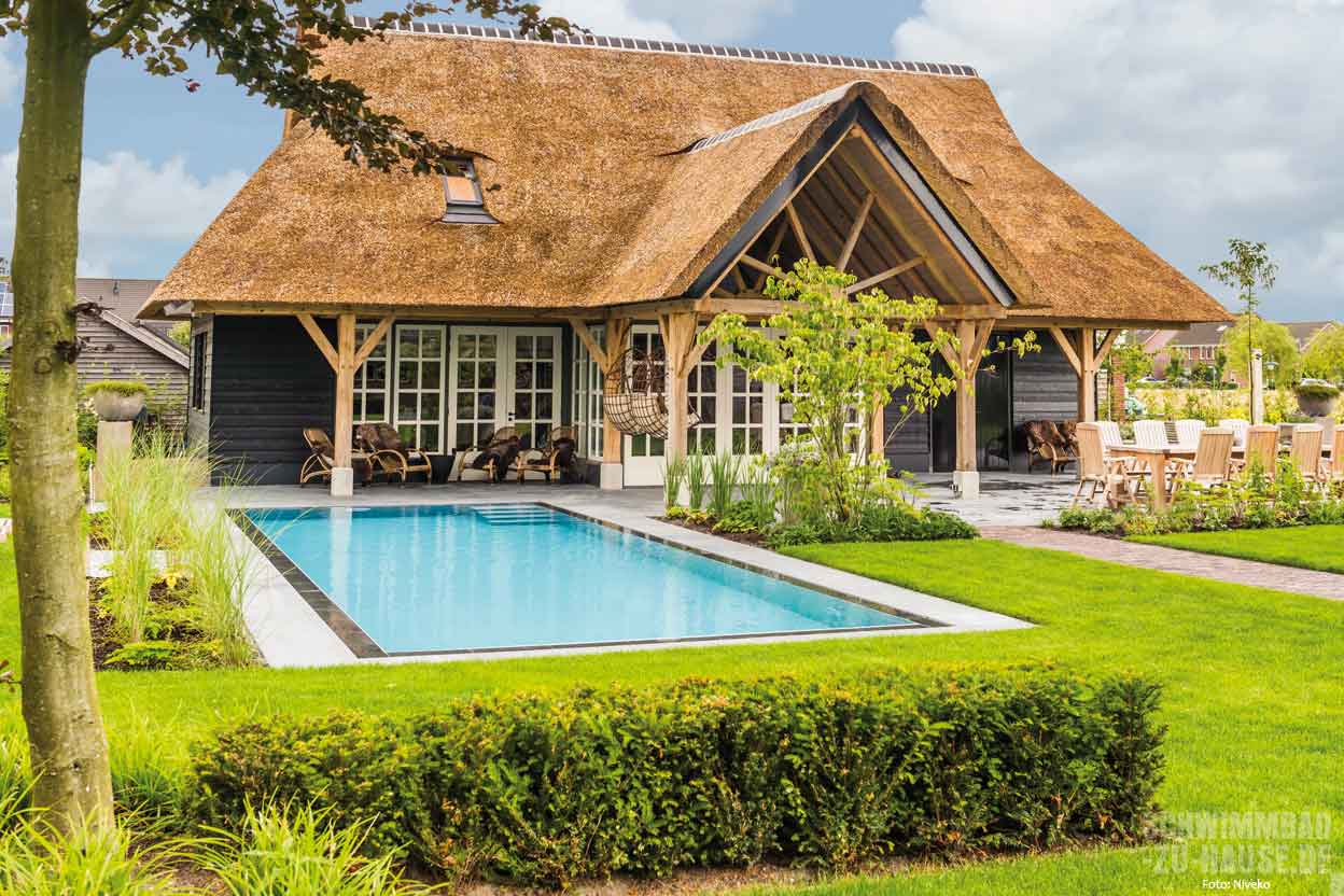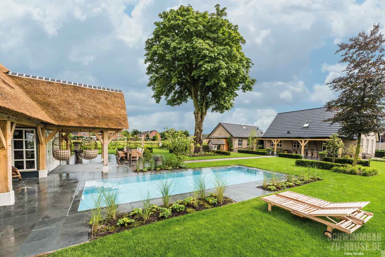 Sommerlicher Badespaß für die Kinder und die Möglichkeit, ungestört am Wasser zu entspannen, wann immer man möchte: Das waren für die Eheleute Kroon die Hauptgründe, warum sie sich für einen Pool im eigenen Garten entschieden. Das Ergebnis ist eine gelungene Verbindung zwischen dem rustikalen Charme eines reetgedeckten Landhauses und einem modernen, geradlinigen Schwimmbad.
