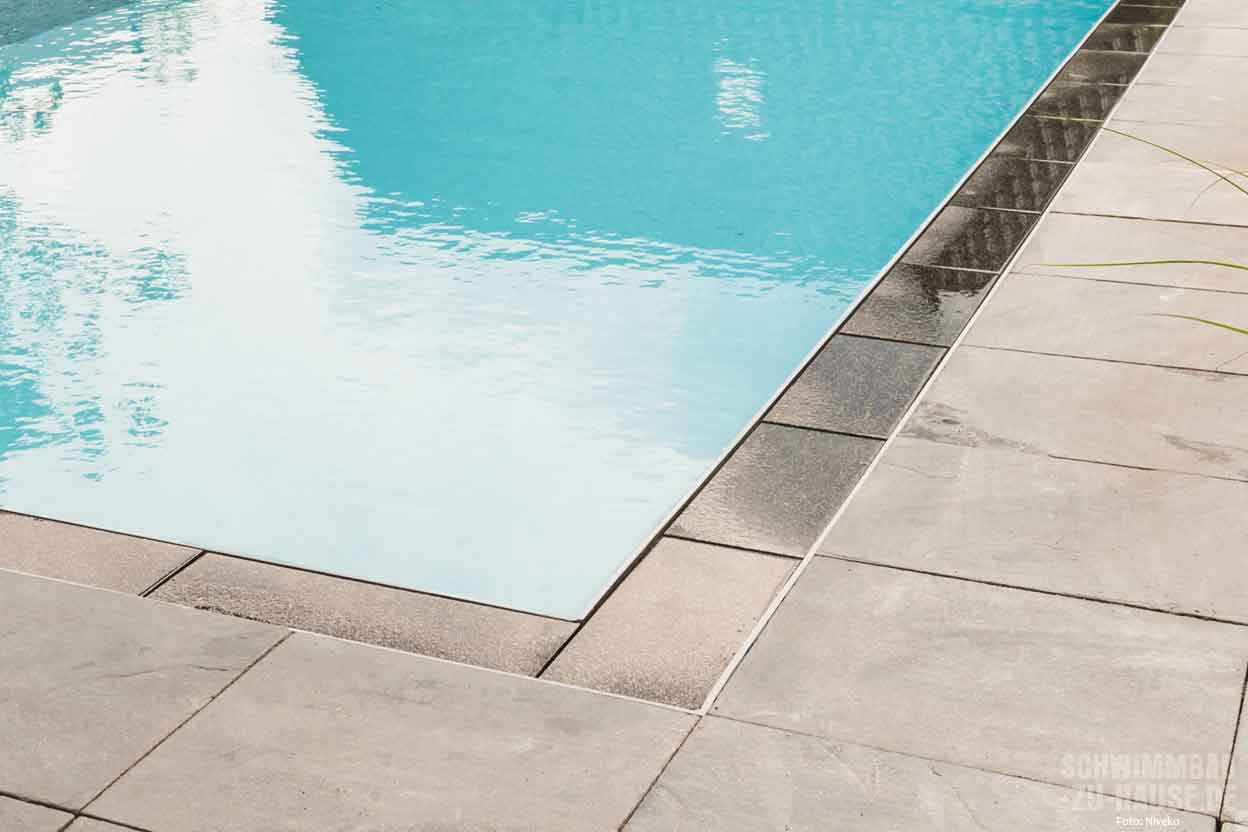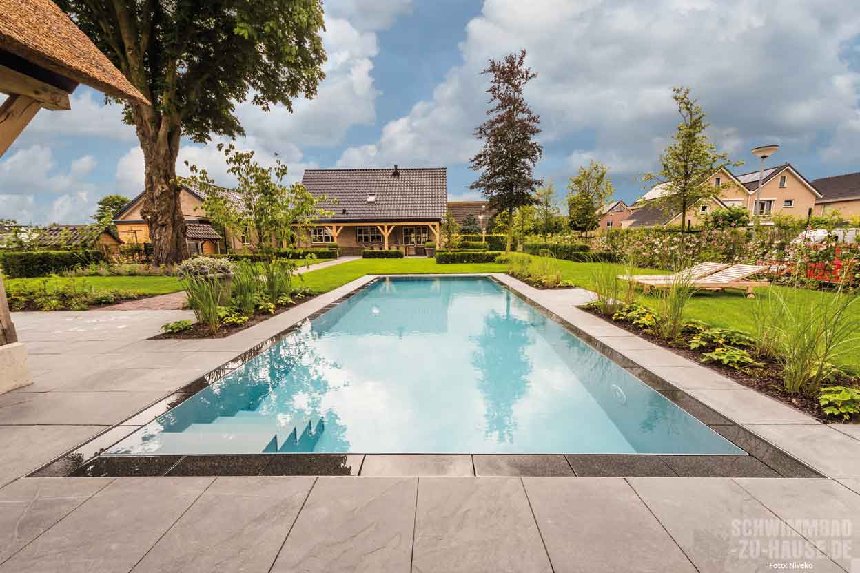 Kundenwünsche erfüllen. Das Niveko-Becken vom Typ „Überlauf Multi“ besteht aus einem Hightech-Polymer-Material, das sich durch eine lange Lebensdauer und hohe Belastbarkeit auszeichnet. Die dauerhaft glatte Oberfläche macht es sehr pflegeleicht, die dunkle Steinumrandung in Verbindung mit der grauen Beckenfarbe verleiht dem Pool einen edlen Touch. Mit Edelstahl-Einbauteilen für Düsen und LED-Beleuchtung und einer Solar-Lamellenabdeckung ist der Pool hochwertig ausgestattet und kann durch die schmale Einstiegstreppe vom Typ „Modern“ auf seiner vollen Länge zum Schwimmen genutzt werden.