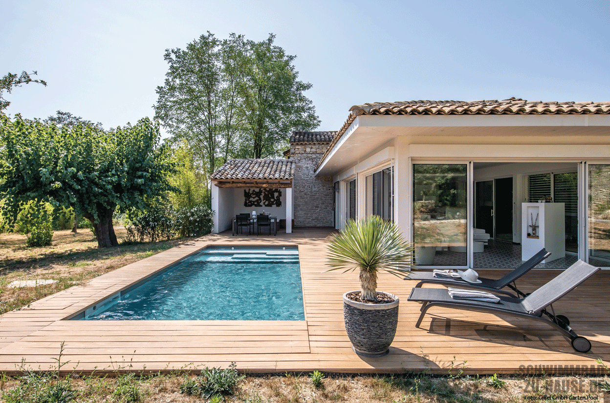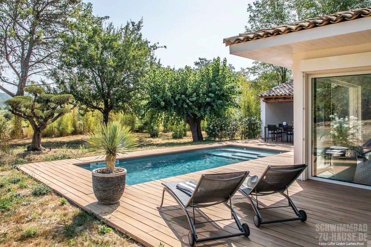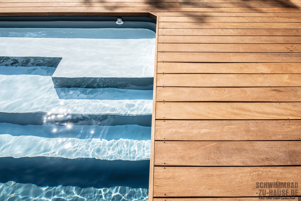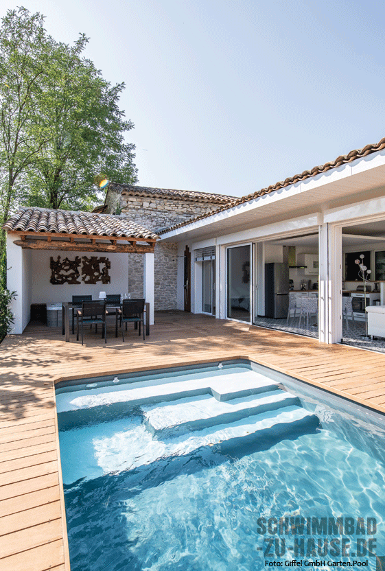 Breite Treppenstufen ermöglichen einen einfachen Einstieg ins Becken, in dem zwei LEDs am Abend für eine stimmungsvolle Beleuchtung sorgen. Ein Rollladen hält zusätzlich bei Nichtnutzung den Schmutz vom Wasser fern und sorgt so dafür, dass die Magie dieses malerischen Ortes jederzeit erhalten bleibt. Mit dem Resultat ist der Bauherr äußerst zufrieden, was angesichts der harmonischen Gestaltung sowie der hochwertigen Materialien, die verwendet wurden, keine große Überraschung ist.