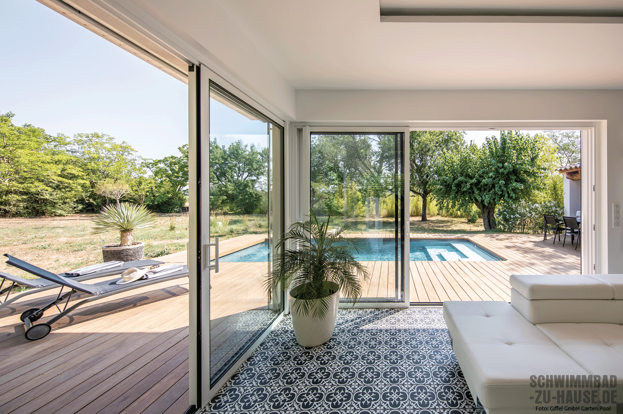 Auch das 8,00 x 4,00 Meter große Becken wird höchsten Ansprüchen gerecht. So arbeitet das verbaute Filtersystem mit Rücksicht auf die Umwelt mit einer Kartusche und ermöglicht so das Filtern von 30 Kubikmetern Wasser pro Stunde, was wiederrum den Einsatz von chemischen Aufbereitungsmitteln verringert. Zudem wird der Pool dank der eingesetzten „I-Magi-X“-Lösung vollautomatisch betrieben, wodurch Heiz- und Aufbereitungszeiten optimiert werden und damit in letzter Instanz der Stromverbrauch erheblich gesenkt werden kann.
