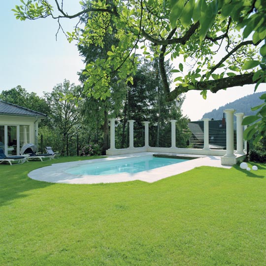 Alles in allem eine Anlage, die nicht viel Arbeit macht und durch die zuverlässige Technik wenig Wartung benötigt. Auch Amina und Tino Heimwanger sind mit ihrem neuen Pool glücklich. Seit dem Bau der Anlage haben die beiden bereits viele Sonnenstunden am eigenen Pool verbracht. Kein Wunder, die blauen Poolliegen laden ebenso wie das verträumt spielerische Säulenambiente zum verweilen ein. „Die ganze Familie hat einen Riesenspaß mit der gelungenen Anlage und ist vollauf zufrieden“.