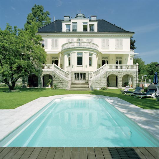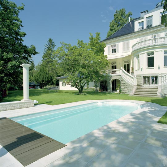 Denn auch wenn die beiden an einem der wärmsten Punkte in Deutschland, dem Badenerland, leben, wollte man sich doch nicht auf die Sonne alleine verlassen. Der Pool liegt auf der Südseite der repräsentativen Villa in einem parkähnlichen Garten. Bernhard Henne, der mit seiner Schwimmbadfirma die Anlage gebaut hat, wurde im Rahmen der Haussanierung hinzugezogen. „Die Vorstellungen von Amina und Tino Heimwanger waren sehr konkret. Wir stellten den beiden verschiedene Schwimmbeckentypen vor und schlugen ein Modell mit integrierter Unterflurabdeckung vor. Dies bedeutet, dass die Rollladenabdeckung bereits im Becken ab Werk eingebaut ist. Außerdem rieten wir zu einer römischen Treppe, da diese zum Stil der Villa passt. Die Treppe ist sozusagen die Vorsetzung der Villentreppe, die vom Haus zum Garten führt“, sagt Bernhard Henne.