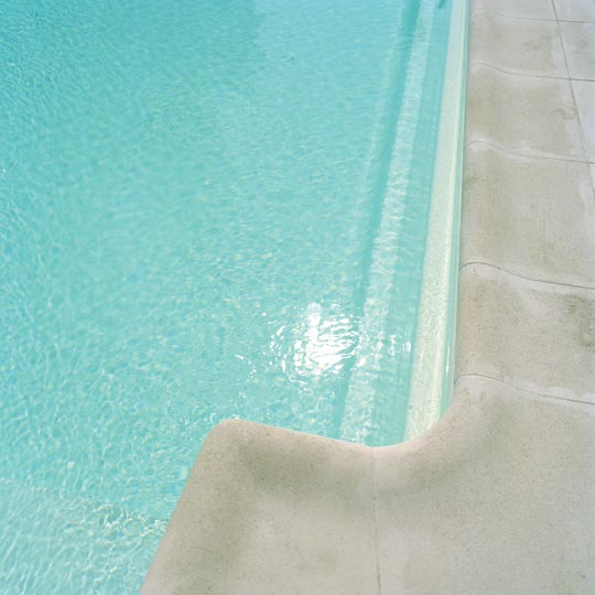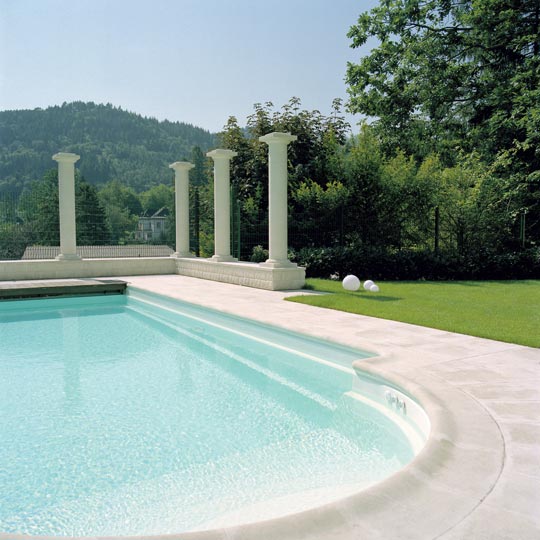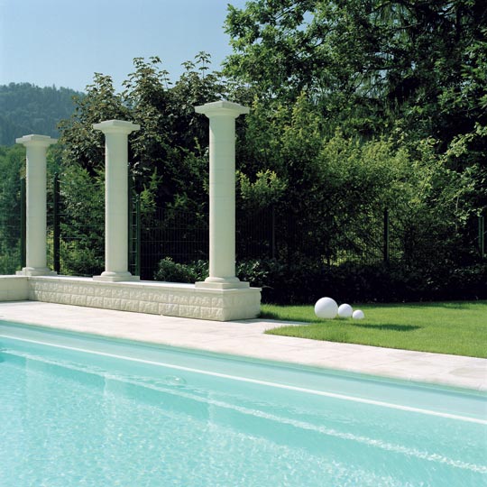 Vielleicht war es ja genau diese römische Treppe in den Pool, die Amina und Tino Heimwanger zu einem ganz besonderen optischen Highlight animierte. Auf der Stirnseite des Beckens platzierten die beiden eine römische Säulenwand. In ihrer Wirkung antik, in der Ausführung aber modern, stellen die Säulen eine optische Einheit zum zuckergussfarbenen Weiß der Villa her. Wenn man jetzt im Wasser seine Runden zieht, dann scheint es manchmal so, als trügen die Säulen den blauen Sommerhimmel. Diese Lage zwischen Himmel und Erdeist es, die den Unterschied zu so manchem anderen Schwimmbad ausmacht. Wegen der Hanglage ihrer Villa genießen die Heimwangers aus ihrem Pool einen einmaligen Blick auf den Schwarzwald.