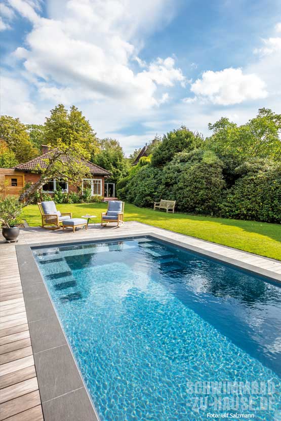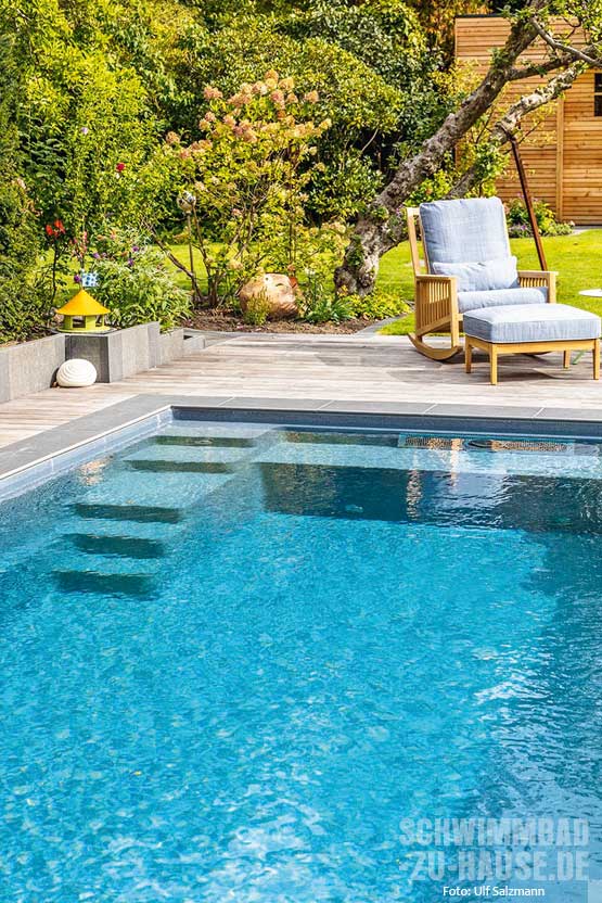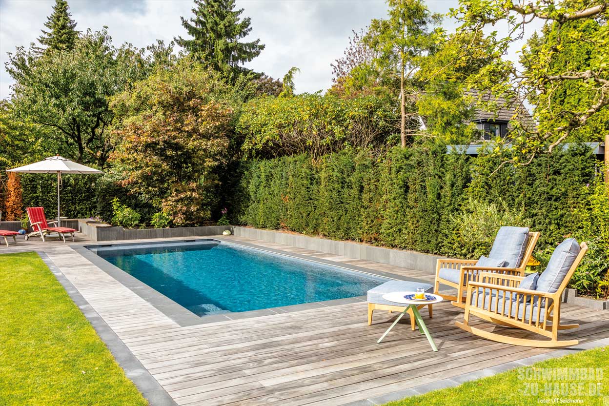 Neben der Turbinenschwimmanlage verfügt der Pool von Familie Kruse noch über weitere Extras wie zum Beispiel eine LED-Beleuchtung sowie Massagedüsen. Das Schwimmbecken ist zudem mit einer elektrischen Abdeckung ausgestattet, die Laub und Schmutz vom Wasser fernhält. Zum Garten hin wird der Pool von Fliesen aus Feinsteinzeug umrahmt. An sie schließt sich eine Holzbeplankung an, die an einer der Stirnseiten des Schwimmbeckens in eine kleine Terrasse mündet. Hier kann man nach dem Schwimmen oder Aquajogging herrlich entspannen und den Blick über den Garten schweifen lassen.