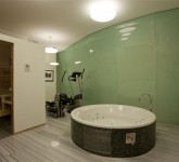 Auch das Schwimmbad hat sich dem Konzept angepasst, sprich: mit geschwungener Form schmiegt er sich an die Fassadenfront. Wunderbar ist hier die Weiterführung der konzeptionellen Grundidee der Reis­terrassen sowie die Verbindung zum See durch das Element Wasser. Das Schwimmbad ist mit Flüssigkunststoff abgedichtet und mit Glasmosaik belegt. Die Poolumgehung besteht, wie der Großteil des Bodenbelags dieses Objekts, aus gestreiften Marmorplatten. „Das tiefe Blau des Schwimmbad wird durch den Verlauf im Glasmosaik unterstrichen“, weiß Thomas Schreiber, der federführende Architekt. Das Wasser, die Beleuchtung und die Details des Schwimmbad wurden erstrangig für die Architektur eingesetzt und erst in zweiter Linie zum Baden. Denn der Besitzer selbst nutzt den Schwimmbad kaum, es sind mehr die Enkelkinder und die Gäste, die sich im Sommer am kühlen Nass erfreuen. So konklusiert Schreiber über das Wellnesselement im dritten Stock: „Der Schwimmbad bei diesem Objekt ist ein gestalterisches Element, das alleine durch seine Präsenz ganzjährig Freude bereitet.“