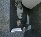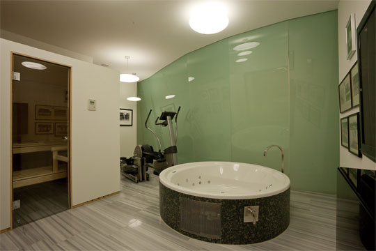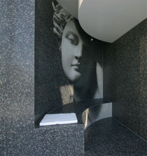 Für den Wohnbereich wurde ein einheitliches Design gewählt. Die Möbel an den Glasfronten nehmen die geschwungene Form des Hauses auf, die einzig auffällige und wiederkehrende Farbe ist Rot. Der Tisch beim Essbereich im vierten Stock wurde, neben vielen anderen Möbeln, speziell für dieses Haus entworfen. „Der Bodenbelag ist aus gestreiften Marmorplatten und bringt die geschwungenen Elemente noch besser zum Tragen“, weiß Thomas Schreiber und verrät: „Die Platten wurden so sortiert, dass im Inneren des Hauses mehr Striche auf den Platten sind und nach außen hin immer weniger, wodurch der Boden von innen nach außen immer heller wird.“ Einen speziellen Boden besitzt das Dampfbad. Mit Bisazza-Mosaik und dem Konterfei einer weiblichen, griechisch-anmutenden Büste ausgestattet, ist es der Relax-Rückzugsort des Hausherrn. Auch von hier aus kann man durch die große Glasfront wunderbar den Blick über den See genießen. Neben dem Schwimmbad und dem Dampf­bad hat das Haus noch mehr Wellness­elemente zu bieten. Ange­fan­gen bei dem großzügig angelegten und ausgestatteten Bad, das wand­­los an den Schlaf­bereich grenzt. Auch hier Mosaik und feinste Armaturen. Zusätz­lich finden sich noch eine Finnische Sauna, ein rundes Whirlbecken und diverse Fitnessgeräte im dritten Stock.