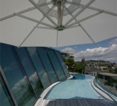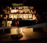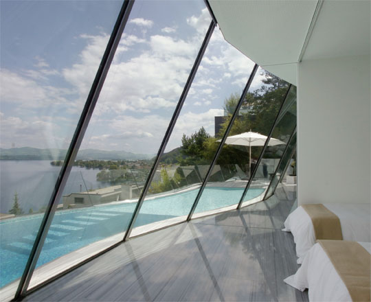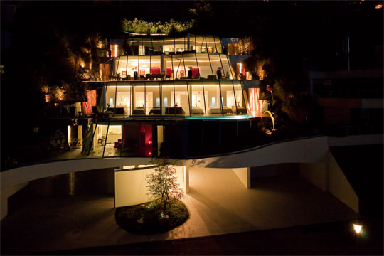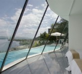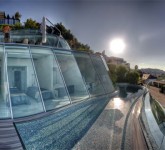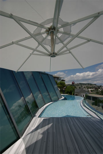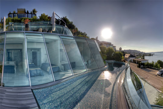 Rund 12.000 Kilometer Luftlinie liegen zwischen dem Ursprung einer Idee und ihrer Ausführung. Die Reisterrassenfelder Indo­ne­si­ens waren es, die den Architekten dieses Objekts am Schweizer Zürichsee zum Bau eines einzigartigen Hauses inspirierten. Während in Indonesien auf den geschwungenen Terrassenfeldern Reis angebaut wird, dienen die Terrassen in der Schweiz allerdings zum Relaxen. An dem steilen Hang am Seeufer wurde ein fünfstöckiges Gebäude errichtet und in den Felsen verankert. Dabei erzielt das strenge architektonische Konzept in seiner Endfassung eine überzeugende Großzügigkeit und Leichtigkeit. Ausschlag­gebend dafür sind die dreidimensionalen, in Form eines sanften S verlaufenden Fassaden­­fronten mit ihren geneigten Glas­ebenen. Diese organische Form wird mit ihren konkaven und konvexen Knicken zu einer fließenden Fassadenfront. Es wirkt fast, als würden die Terras­sen tanzen. Und der größte Tänzer auf dieser Bühne ist das Schwimmbad.