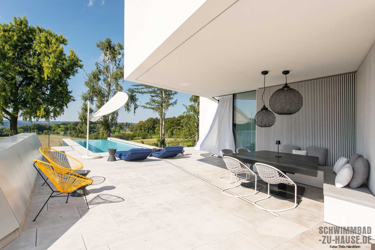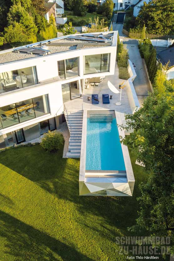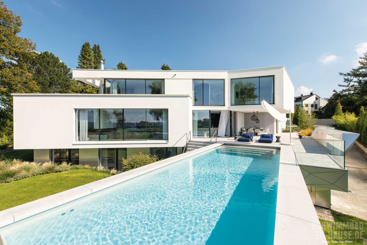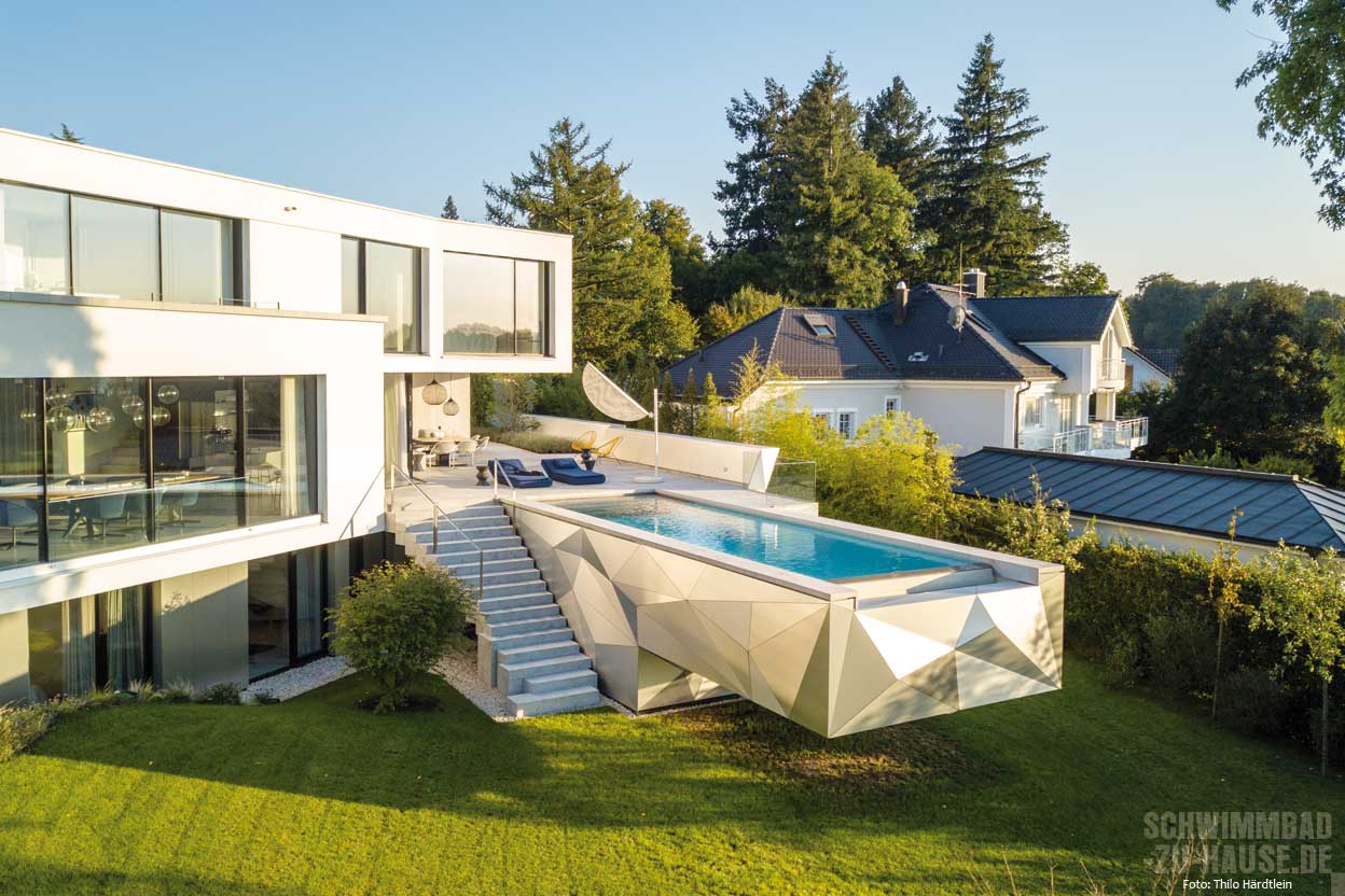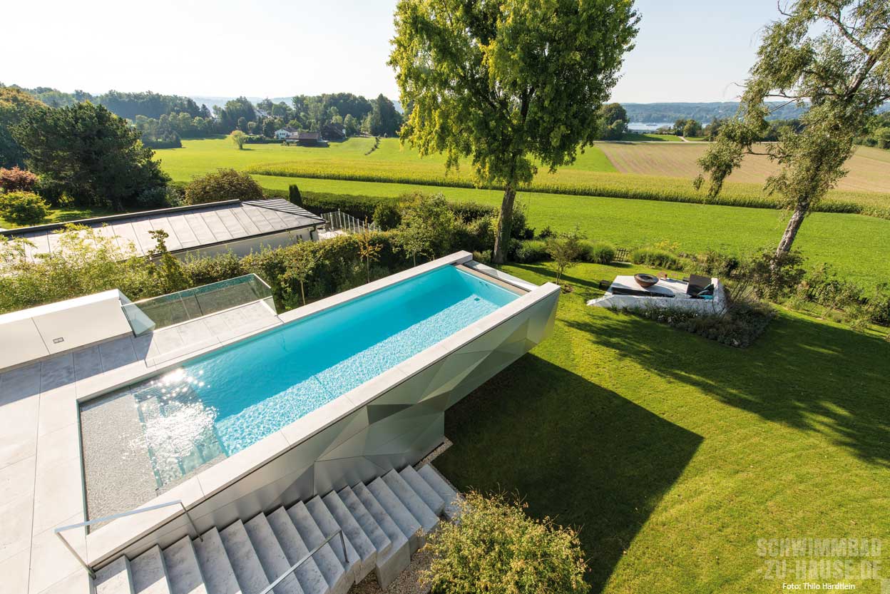 Mit Superlativen sollte man ja vorsichtig umgehen, denn eigentlich ist jedes Schwimmbadprojekt für sich einzigartig. Doch dieser Pool im Münchner Umland ist einfach nur spektakulär. Die herauskragende Bauform und die reliefartige Beckenverkleidung machen ihn zu einem modernen, beinahe futuristisch anmutenden Kunstobjekt mit wunderbarem Infinity-Blick auf Wiesen, Felder und See.
