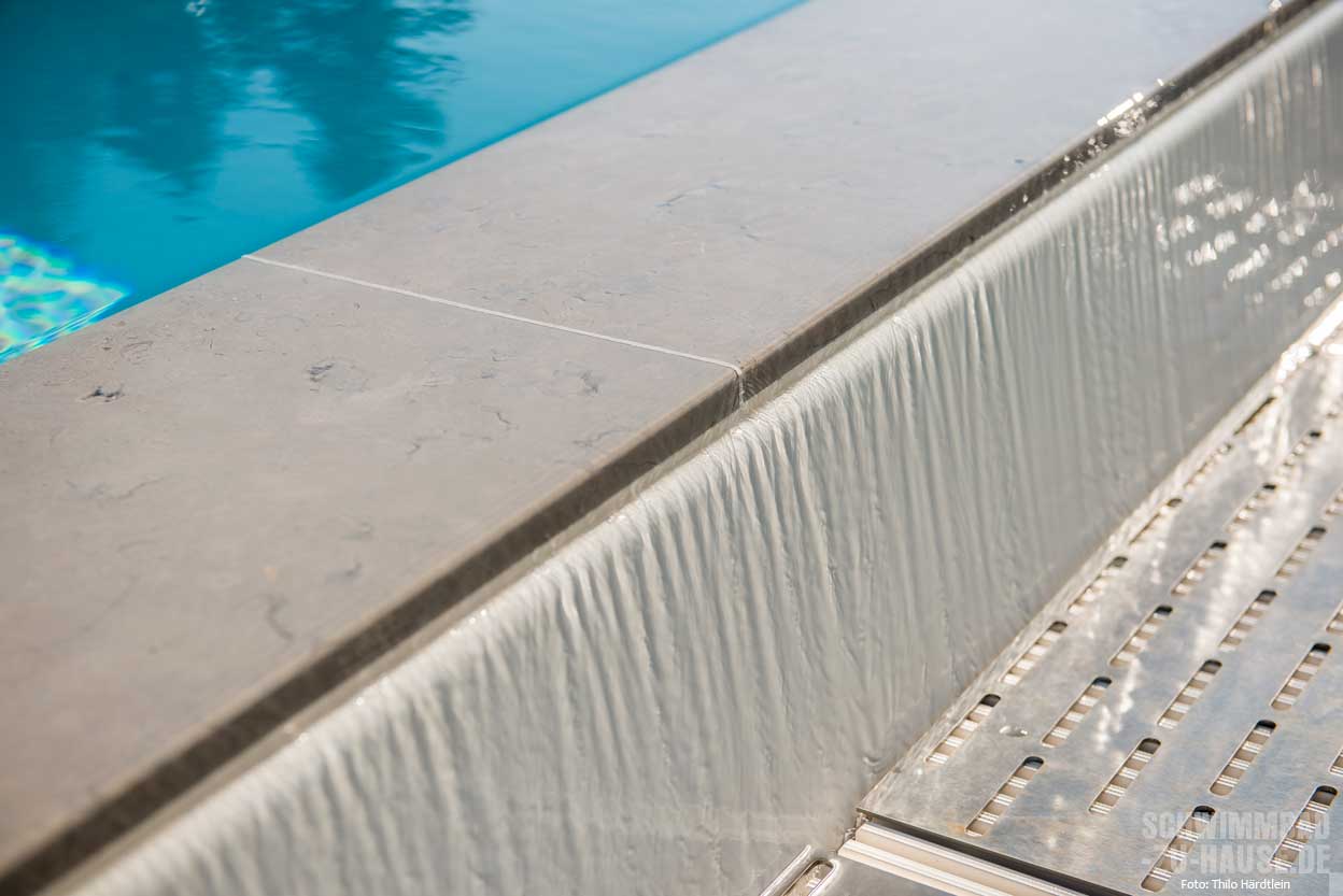 Die mit Natursteinen belegte Einstiegstreppe des GFK-Beckens bildet einen harmonischen Übergang zur Terrasse. Von hier genießen die Hausherren einen unverbauten Blick über ihren Pool in die Natur, der mindestens ebenso exklusiv ist wie das Objekt selbst.