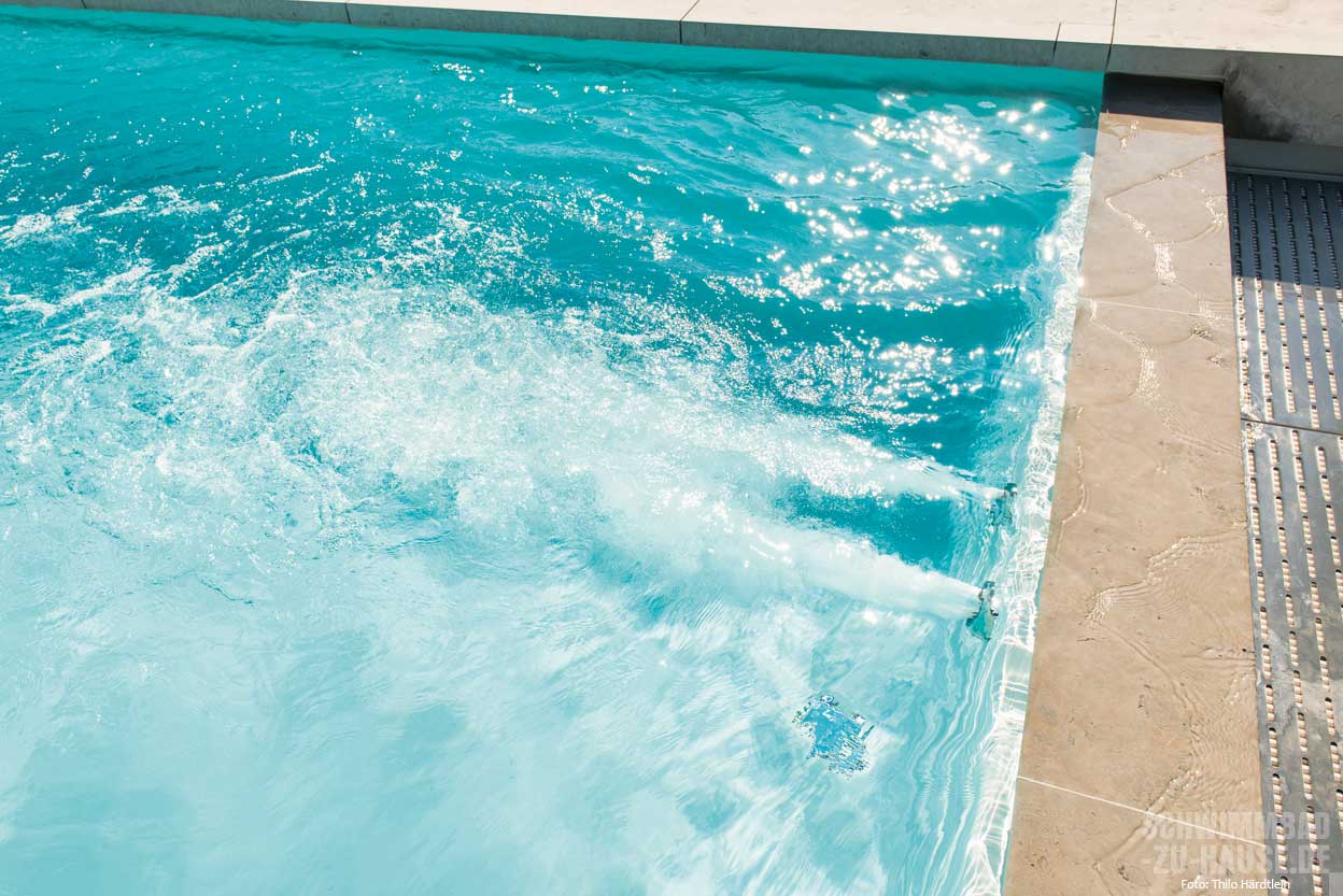 „Wir haben mit Architekten und Bauleitung geplant, wie wir das Becken am besten eingefädelt bekommen, und dann die Monteure auf Diät gesetzt“, schmunzelt Oliver Wilkens. Diese mussten nämlich in einer provisorischen Aussparung zwischen Betonwanne und Fertigbecken arbeiten, um die Rohrleitungen innenliegend zu verlegen. Eine intensive Vorbereitung, zahlreiche Besprechungen und eine enge Abstimmung mit den beteiligten Fachfirmen sind bei einem solchen Projekt absolute Voraussetzung.