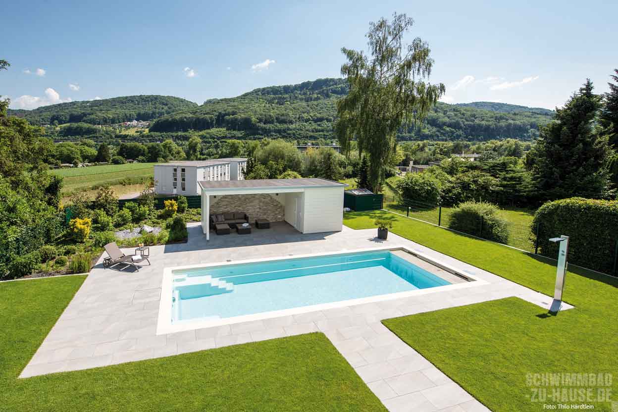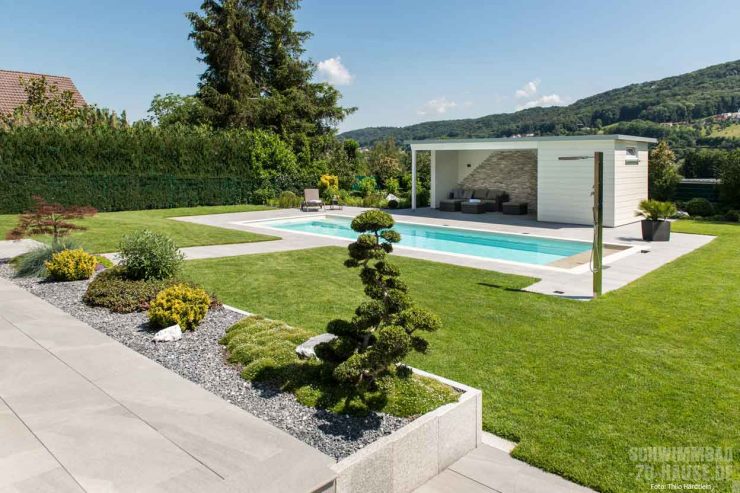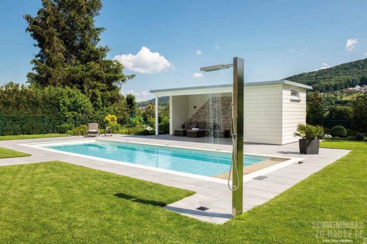 Primär wäre hier die Firma Hügel Gartenbau in Rümmingen zu nennen. Das erfahrene Team war für den Poolbau, die fachgerechte Schwimmbadtechnik und den Gartenbau zuständig. Andere Arbeiten wie Poolhaus, Elektrik, Duscheninstallation, Bewässerung sowie Tiefbau- und Belagsarbeiten waren Einzelgewerke, die wir mit ortsansässigen Fachfirmen gelöst haben. Im Prinzip hatten wir selbst die Bauleitung und mussten koordinieren, damit alles zeitlich reibungslos ineinanderläuft. Ein großer Vorteil ortsansässiger Firmen ist die räumliche Nähe, da bei Problemen sofort jemand vor Ort sein kann, um die Lösung herbeizuführen.