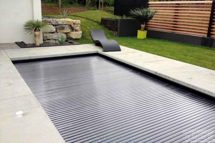 Flach auf dem Wasser liegend erzielen Rollladenabdeckungen einen ähnlichen Effekt: In Verbindung mit einem rings um das Becken installierten Handlauf oder einer Auflagekante unter dem Wasserspiegel halten die smarten Abdeckungen – je nach Modell und Profilstärke – unterschiedlichsten Belastungen stand. Das Prinzip dahinter ist recht simpel. Größere, mit Luft gefüllte Hohlkammern in den einzelnen Lamellen nutzen die Auftriebskraft in Verbindung mit Wasser und bilden so einen Widerstand, der das Gewicht von einem kleinen Kind oder einem Haustier auffangen kann.