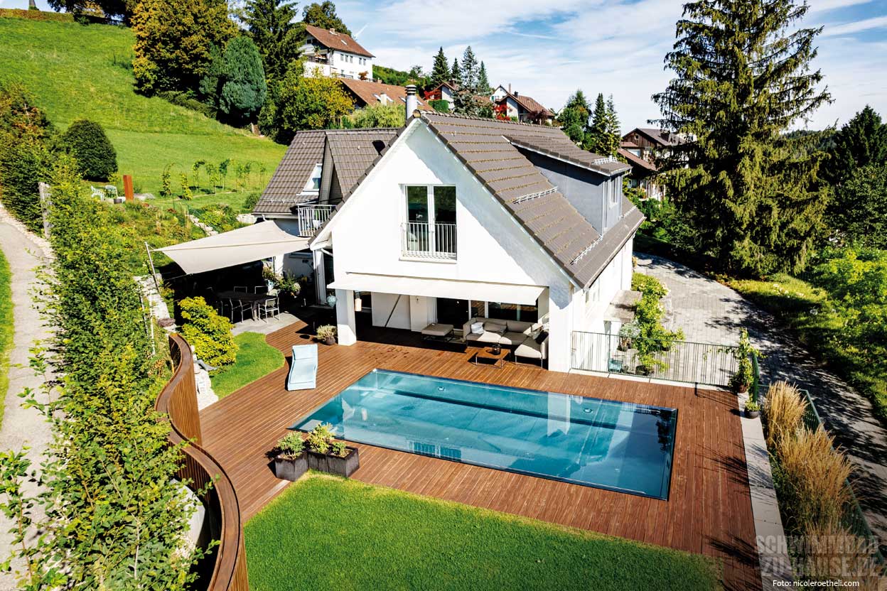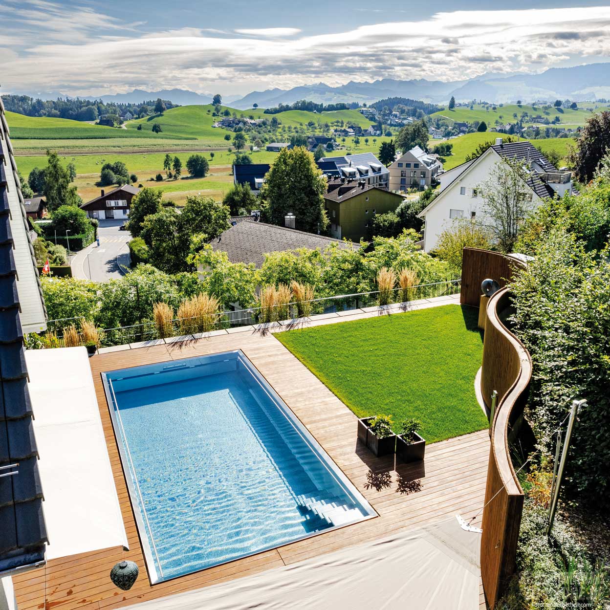 Die eigenwillige Form des Gartengrundstücks – ein rechtwinkliges Dreieck – auf welchem der Pool errichtet werden sollte, erforderte viel Geschick und Fantasie des Poolbauunternehmens Vivell Schwimmbadtechnik, des Gartenarchitekten Guido Syfrig und des Gartenbauers Marcel Staub. „Einen erfahrenen Architekten und Gartenplaner beim Schwimmbadbau miteinbeziehen, würde ich jedem Bauherren empfehlen, der ein ähnlichesProjekt umsetzen will“, betont der Eigentümer. Vor allem hinsichtlich der Ästhetik des Schwimmbads, aber auch was die Terminkoordination anbelange, sei ihm Guido Syfrig eine große Hilfe gewesen.