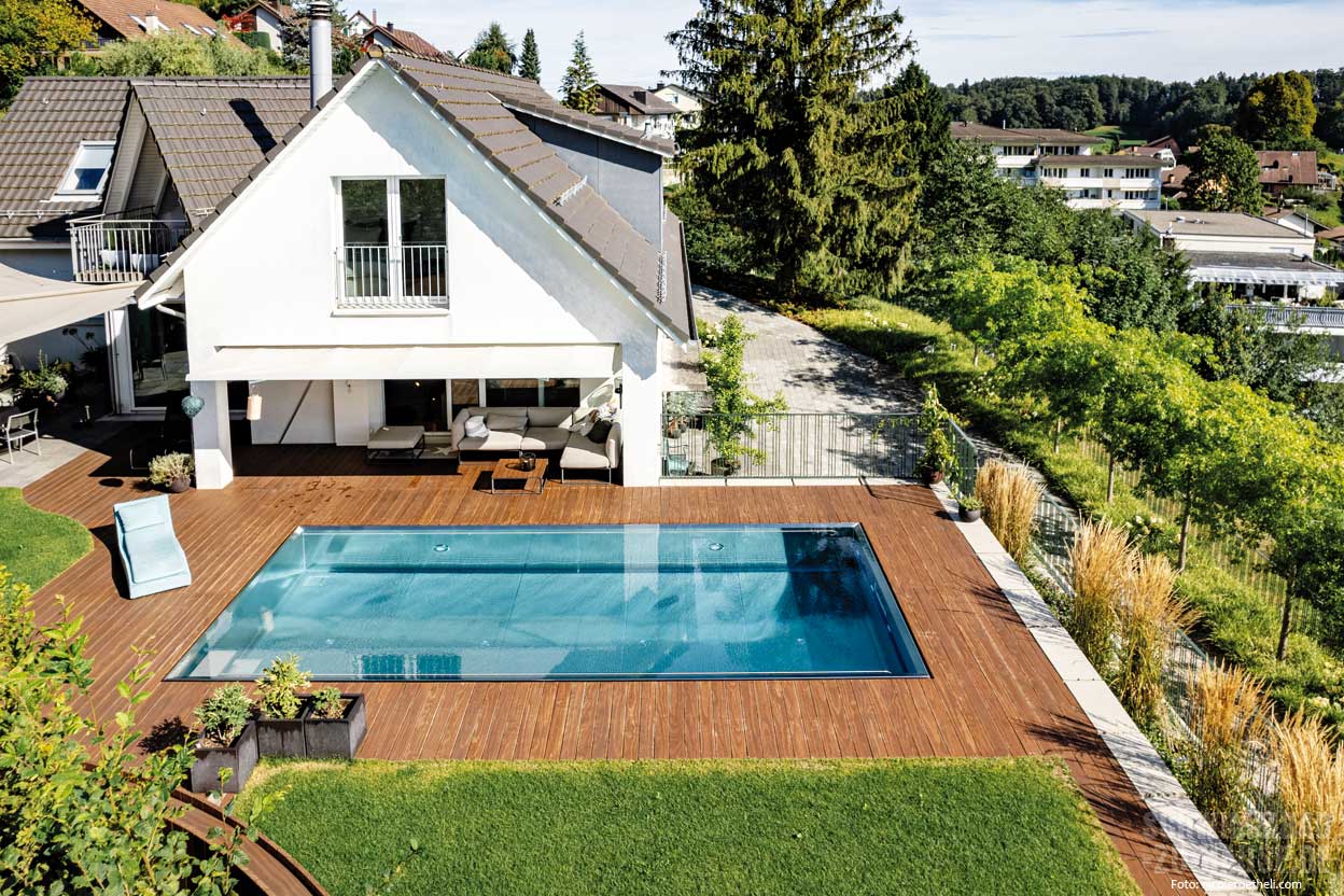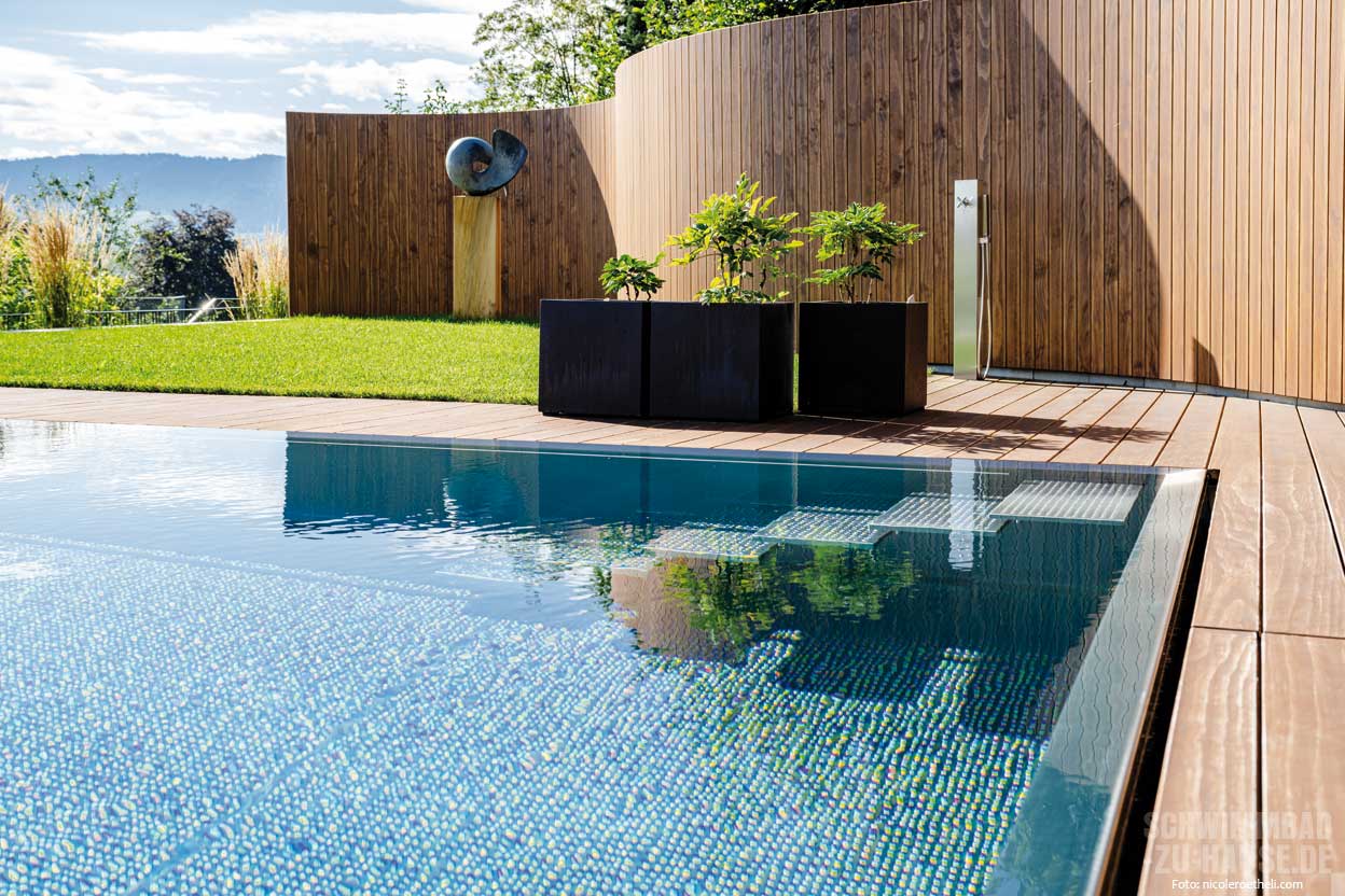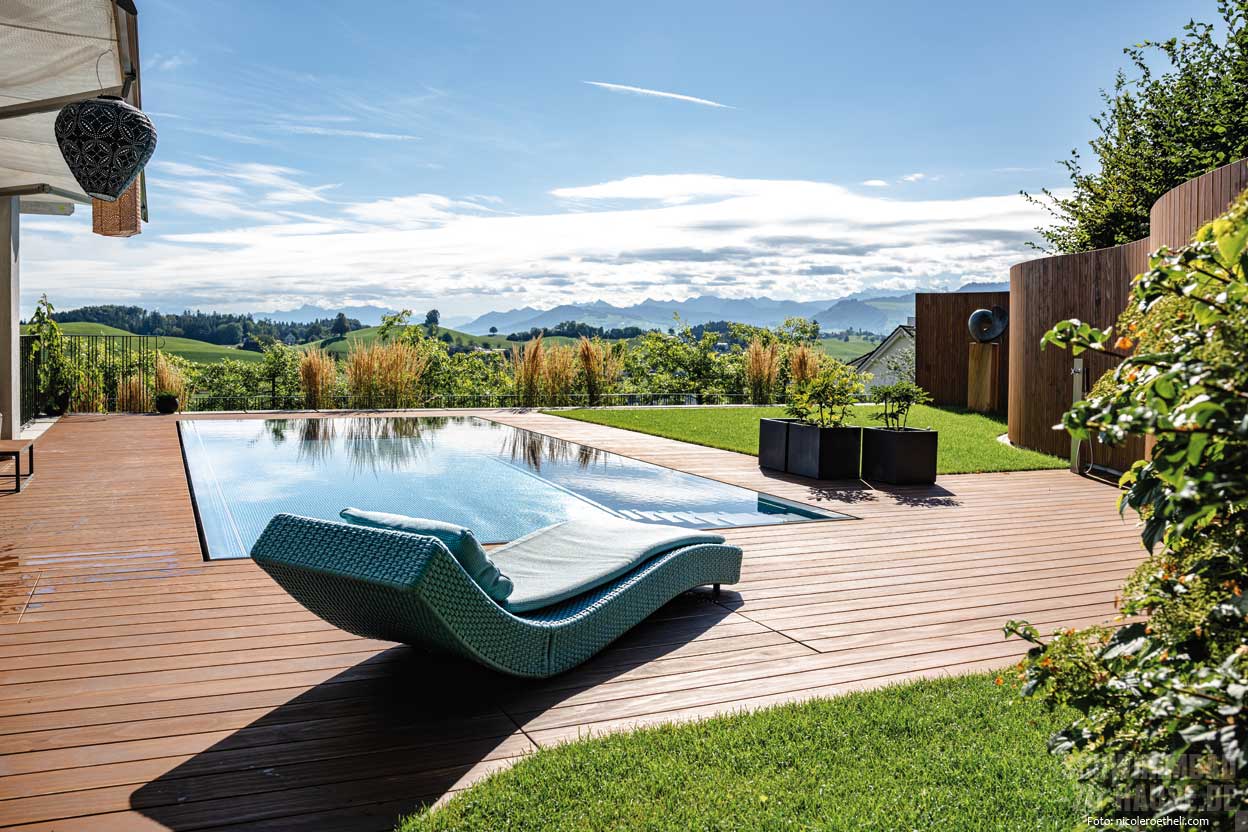 Dank der Überlaufrinne legt sich die umgebende Holzveranda wie ein warmer Mantel nahtlos um den Pool herum und bildet auch die Unterlage für einen sonnigen Ruheplatz mit Liege sowie eine wetter-