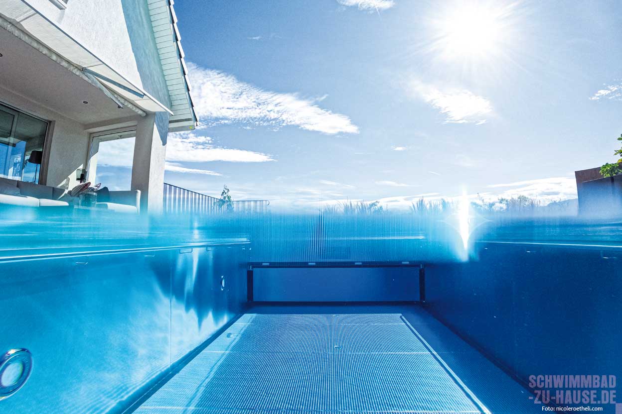 In seinem sonnigen Garten hat sich der Eigentümer eines am Hang gelegenen Einfamilienhauses einen Traum verwirklicht: ein stilvolles, pflegeleichtes Schwimmbad von Vivell Schwimmbadtechnik, das Wohlfühloase und Trainingselement gleichzeitig darstellt.