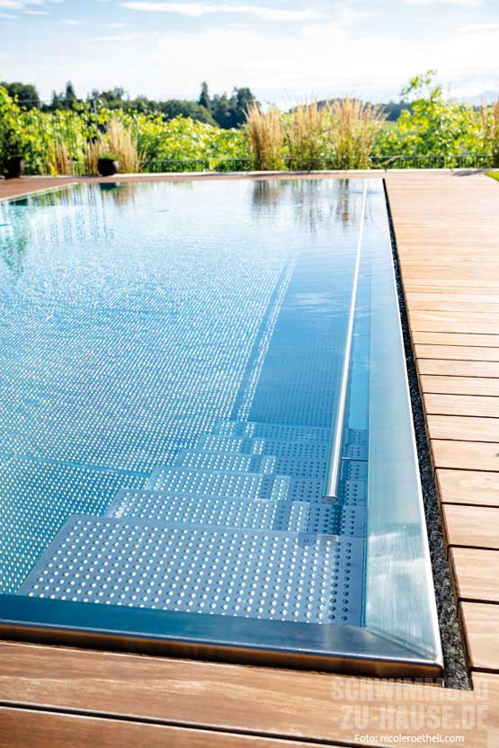 Das Becken weist die stattliche Größe von 7.5 Meter Länge, 3.5 Meter Breite und 1.4 Meter Tiefe auf und wird durch eine separate Wärmepumpe beheizt. Eine Solar-Abdeckung trägt ebenfalls zur nachhaltigen Erwärmung des Wassers bei. Zwei LED-Scheinwerfer erhellen das Becken in der Nacht. Die Schwimmbadtechnik verbirgt sich diskret in der Garage des Hauses. „Die Ästhetik war mir wichtig“, erklärt die Bauherrin. Deshalb habe sie sich für eine Überlaufrinne entschieden, ebenso wie für ein Becken aus Edelstahl der Firma Mauchle. Zur integrierten automatischen Überwachung und Regulierung der Wasserwerte sowie der Schwimmbadfunktionen habe ihr der Gartenarchitekt geraten. „Ich möchte dies nicht mehr missen“, stellt die Bauherrin klar.