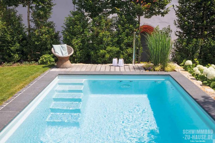 Inspirationen für die Gestaltung des Pool-Projekts fanden die Bauherren in einem ihrer Urlaubsvideos, in Fachzeitschriften und letztlich auch im Internet. Während der Recherche stieß man rasch auf den Fertigbeckenhersteller Riviera Pool und wusste: Es sollte ein GfK-Becken von Riviera werden! Nun ging es – in steter Absprache mit den Gartenprofis – an die Positionierung des Beckens und die Wahl des Modells. „Als ich und mein Team die Anfrage zur Realisation dieses einzigartigen Privatpools erhielten, war es bereits beschlossene Sache, dass das Schwimmbecken gegenüber vom Kirchturm und damit etwas versteckt in der hinteren Ecke des kleinen Gartens platziert werden sollte“, schildert Schwimmbadbauer Michael Steglich die Aufgabe, bei der Millimeterarbeit gefragt war. Sowohl hinsichtlich der Optik des Pool als auch der Schwimmbadtechnik hatten die Bauherren klare Vorstellungen: Man wünschte sich ein geradliniges Becken mit einer natürlichen Wasserfarbe, das sich harmonisch in die Gegebenheiten des Gartens einfügt. Sport und Erholung sollten gleichermaßen gegeben sein. Technische Features wie eine Gegenstromanlage, die auch zur Massage genutzt werden kann, und eine zuverlässige vollautomatische Wasseraufbereitung waren hierbei ebenso wichtig wie eine elegante Poolumrandung.