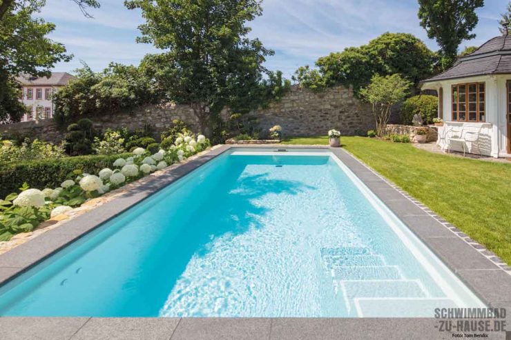 Jetzt fügt sich das kompakte GfK-Becken „Ancona Style“ mit seinen Maßen 8,50 x 3,70 Meter perfekt in den hinteren, etwas höher gelegenen Teil des Gartens ein. Dank der hellen Beckenfarbe „Papyrus“ strahlt das Wasser und wirkt dabei besonders natürlich. Im Kontrast zu der dunkelgrauen Granitumrandung wird dieser Effekt zusätzlich verstärkt. Über eine dezente, schmale Treppe gelangt man komfortabel in das mit einer energieeffizienten Wärmepumpe beheizte Wasser und kann trotz kompakter Abmessungen des Beckens mithilfe einer leistungsstarken Gegenstromanlage das tägliche Schwimmtraining absolvieren. „Wenn das Becken einmal nicht benutzt wird, fährt man einfach die Rollladenabdeckung automatisch über das Wasser“, schwärmt die Bauherrin. Das schützt vor Wärmeverlusten und hält Verschmutzungen von außen fern. Und auch die Wasseraufbereitung, deren Technik in der Garage nicht unweit vom Becken entfernt untergebracht ist, funktioniert vollautomatisch. So bleibt mehr Zeit, den Luxus und die Vorteile des eigenen Pools zu nutzen. „Wenn es doch einmal technische Probleme gibt oder Wartungsarbeiten anstehen, sind Herr Steglich und sein professionelles Team schnell zur Stelle“, lobt die Bauherrin abschließend.
