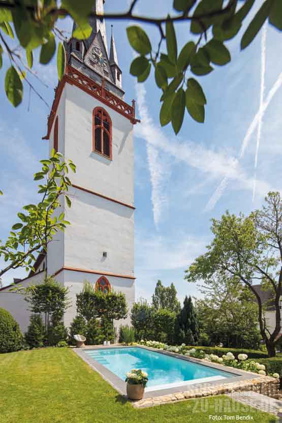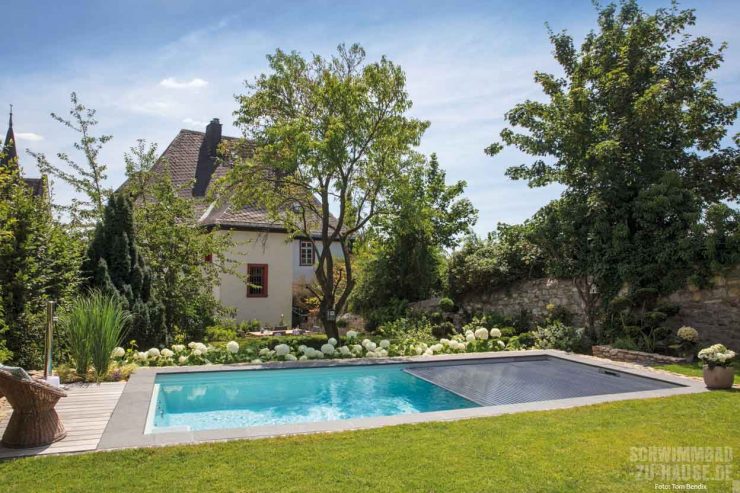 Die Vögel zwitschern, eine sommerliche Brise Weht, der Duft blühender Blumen liegt in der Luft, die Glocke des nahe gelegenen Kirchturms läutet und die Strahlen der Morgensonne tänzeln auf dem Wasser des neuen Pools, der sich harmonisch inmitten eines Hanggrundstücks hinter dem Wohnhaus in einem beschaulichen Dorf in der Nähe von Frankfurt einfügt. Die Geschichte dieses Pool-Projekts ist eine ganz besondere – ebenso besonders wie das Grundstück und seine außergewöhnliche Lage und des unter Denkmalschutz stehenden Wohnhauses einer ehemaligen Schule, die im Jahre 1750 erbaut worden ist. In diesem kleinen Garten stimmt einfach alles. Hier trifft Altes auf Neues, hier wurde jüngst ein individueller Pool-Traum wahr.