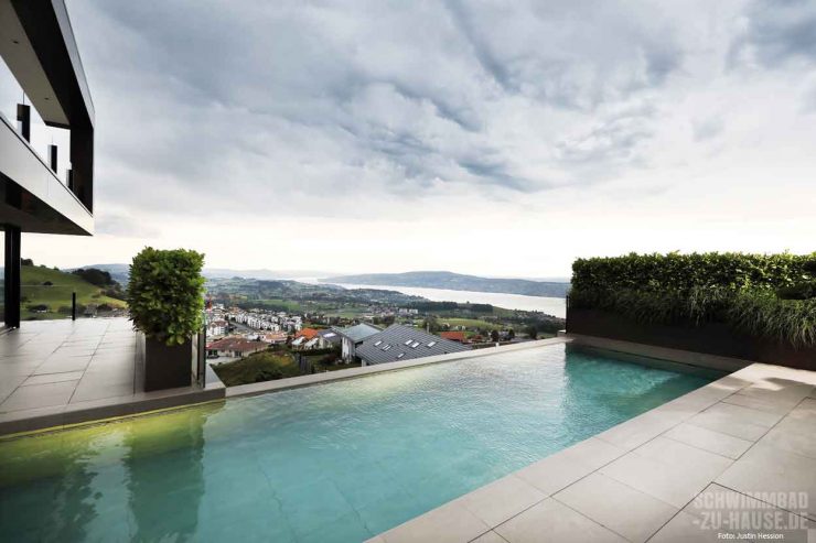 Den einen oder anderen Wodka-Martini – gerührt, nicht geschüttelt – kann man sich auf der Poolterrasse dieses beeindruckenden Wohnhauses mit Blick auf den See und den Sonnenuntergang nach einem langen Arbeitstag durchaus einmal gönnen. Dank der hervorragenden Arbeit von Architekt Patric Simmen und dem Team um Erich Woodtli von Woodtli Schwimmbadtechnik genießen die Bauherren 365 Tage im Jahr Urlaub, und das zu Hause in der Schweiz. Hierbei hatte das Paar bereits vor der Planung des Projekts sehr konkrete Vorstellungen. Schwimmbadbauer Erich Woodtli erinnert sich: „Bei dieser Poolinstallation sollten Architektur, Ambiente, Wellness, Gesundheit, Sport und Fitness harmonisch miteinander verbunden werden.“ Auch der Wow-Effekt spielte bei der Konzeption eine wichtige Rolle.