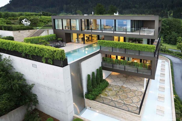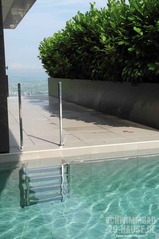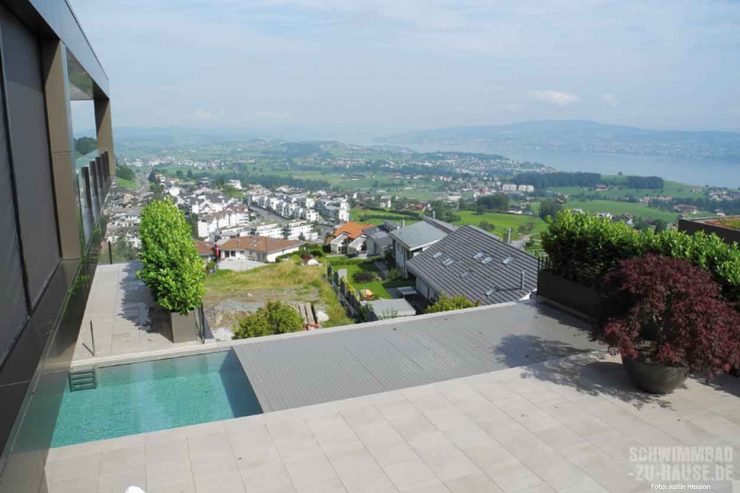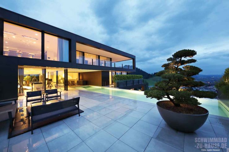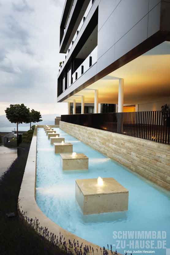 Wenn die Bauherren dieses atemberaubenden Anwesens in der Schweiz nach Hause kommen, empfängt sie Urlaubsfeeling pur: An einem 35 Meter langen Zierbecken entlang, mit neun Jumping-Sets auf Steinpodeste gleitet der Blick einen acht Meter langen Wasserfall hinauf, der in den höher gelegenen Pool mit 8,4 Meter großer Überlaufrinne führt. Oben verwöhnt das Schwimmbecken mit den stattlichen Maßen von 15 x 3,5 Meter mit Wellness, Fitness und Entspannung der Extraklasse. Einfach nur Wow!