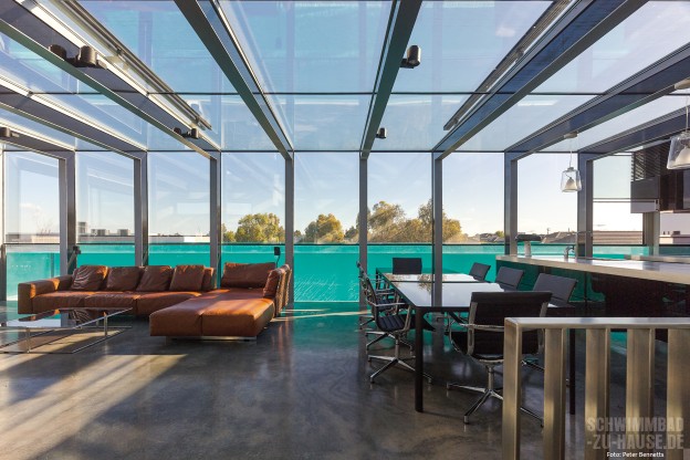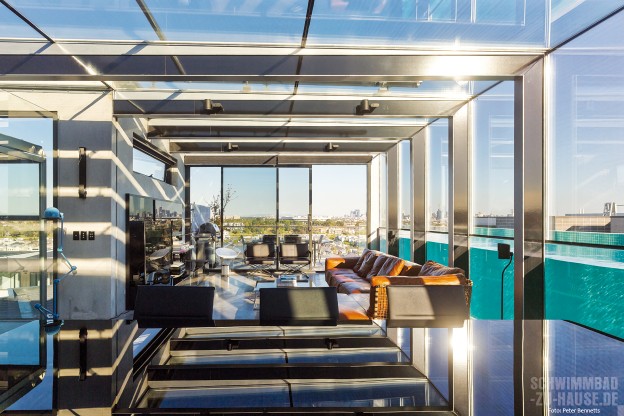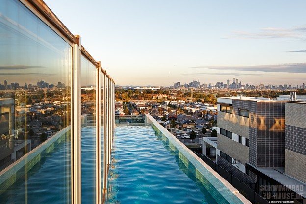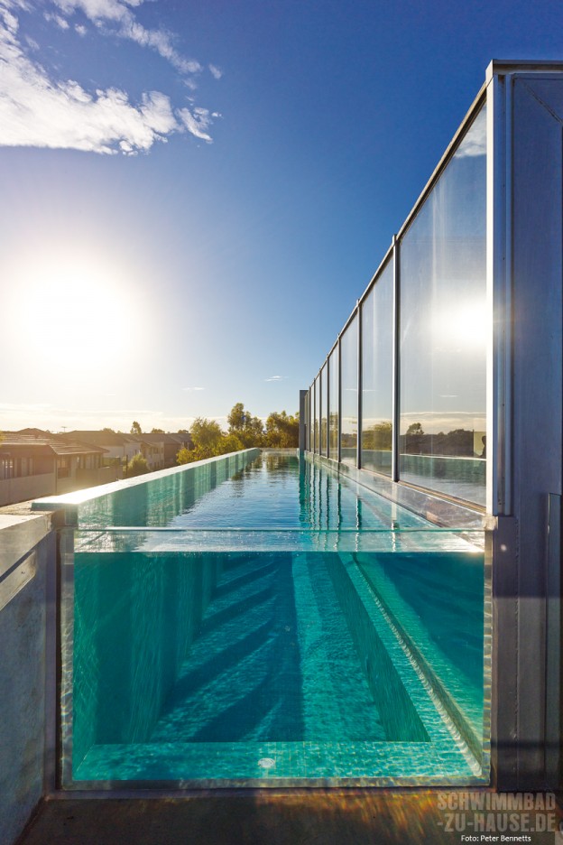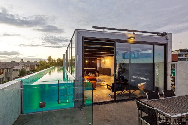Insgesamt dauerte die Fertigstellung des 385 m² großen Wohntraums knapp 13 Monate. Heute können sich die glücklichen Bauherren tagtäglich sportlichen Aktivitäten im 15 Meter langen und 1,6 Meter tiefen Pool widmen oder einfach nur entspannte Momente im Wasser genießen und dabei die Kulisse Melbournes bewundern. Für ein ungetrübtes Badevergnügen im Rooftop-Pool sorgt ein Sandfilter, der jeden Tag zwischen 10 und 16 Uhr in Betrieb ist.