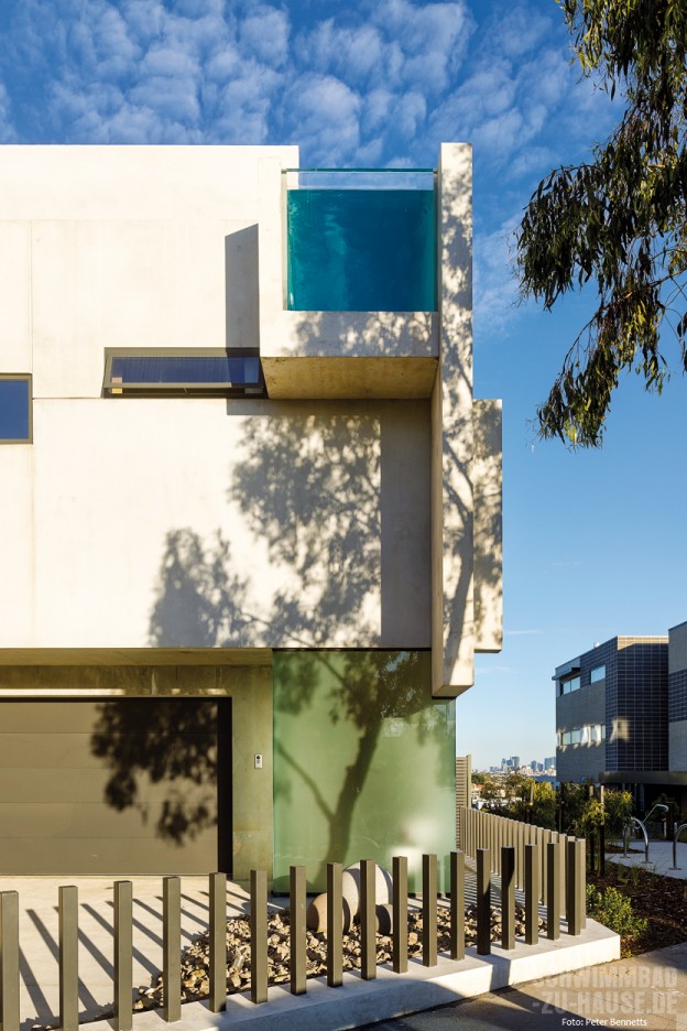 „Ich wollte mit einer minimalen Stoffpalette experimentieren und dabei die standardmäßige Bautechnik umgehen“, verrät uns auf Nachfrage der Architekt Feras Raffoul. Herausgekommen ist ein Anwesen, das zu 95 % aus Beton und Glas besteht und auf die im privaten Bereich übliche Erdung des Pools verzichtet. Das seitlich positionierte Außenbecken wirkt in diesem Kontext, wie ein riesengroßes Aquarium, das eine Verbindung mit der Innen- und Außenwelt eingeht. Denn zum einen eröffnet sich aus dem Pool heraus ein atemberaubender Ausblick auf die Skyline von Melbourne und zum anderen kann man von der Couch aus das bewegte Wasser betrachten. Das Becken ist dabei von drei Seiten einsehbar. Dafür sorgen 85 mm dicke Acrylwände.