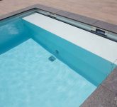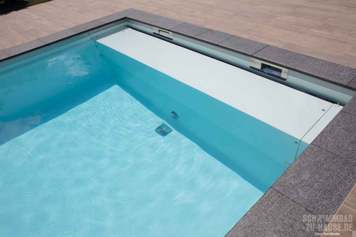 Auch technisch hat der neue Pool einiges zu bieten. Ein ausgeklügeltes Wasseraufbereitungssystem, be- stehend aus hochwertiger Filter- und Dosieranlage von Ospa, sorgt dafür, dass das Badewasser zu jeder Zeit kristallklar und sauber ist. So können sich die Bauherren entspannt zurücklehnen und genießen. Der Einsatz einer Solarrollladenabdeckung entlastet darüber hinaus die alternativ einsetzbare Beheizung über die Haustechnik und schützt bei Nichtbenutzung vor Verschmutzungen von außen. Im Winter, wenn das Wasser aus dem Becken abgelassen wird, garantiert eine Winterabdeckung von Bieri Alpha Covers mit Schneelastträgern, dass der Blick in den Garten nicht durch einen leeren Pool getrübt wird und auch der Unfallschutz im Winter sichergestellt ist.