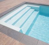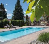 Passend zur cleanen und geradlinigen Architektur des Hauses entschied man sich – in enger Zusammenarbeit mit den Bauherren – für ein Fertigbecken der Firma Riviera Pool. Das gewählte Model „Linear“ in der Farbe „Papyrus“ mit den Maßen 10,45 x 3,70 x 1,50 Meter wirkt elegant und greift die Linearität der Umgebung harmonisch auf. „Mit der Wahl des Beckens wird die doch sehr cleane Optik des Wohnhauses perfekt widergespiegelt und der Pool, das neue Zentrum dieses Gartens, fügt sich perfekt in das Gesamtbild ein“, freut sich Bergmann. Für ein natürliches, warmes Flair zieren großformatige Fliesen in Holzoptik die Poolumgebung. Hier ist zudem ausreichend Platz für Sonnenliegen und gemütliche Loungemöbel zum Relaxen. An der dem Haus zugewandten Stirnseite des Schwimmbads dient eine breite Treppe nicht nur zum Einstieg, sondern bietet zudem eine gemütliche, sonnige Sitzgelegenheit zwischen den Schwimmeinheiten. Stichwort Schwimmtraining: Vor allem die Eltern nutzen die in das Becken verbaute leistungsstarke Gegenstromanlage für ihr tägliches Sportprogramm.