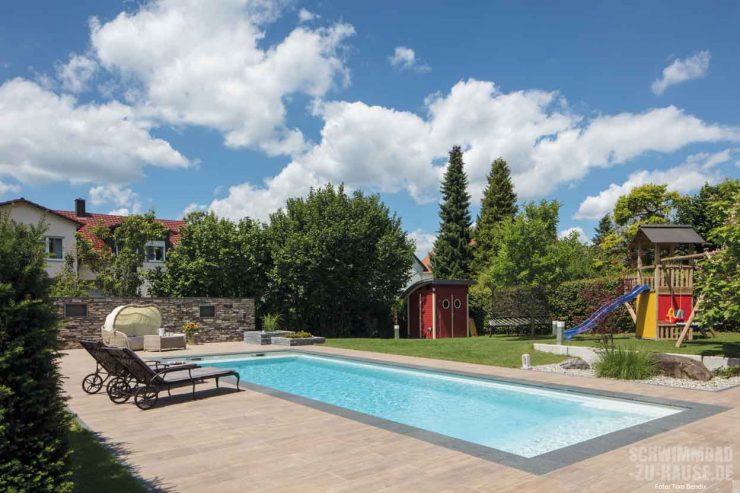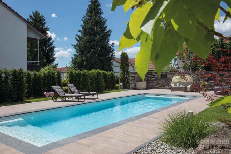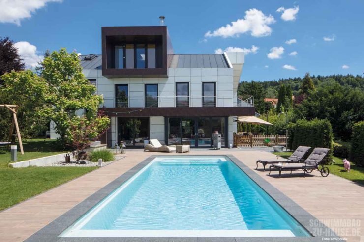 Hat man eine große Familie, so spielt sich ein Hauptteil des Lebens in den sommerlichen Monaten des Jahres draußen im Garten ab. Besonders, wenn die Kinder jung und voller Energie sind, stehen Outdooraktivitäten wie Ballspiele, Gartenpicknicks und Co. ganz oben auf der Wunschliste der Kleinen. Ähnlich sah es im Fall dieser Bauherren aus Oberschwaben aus. Um den Freizeitwert für Jung und Alt zu steigern, entschied sich das Ehepaar für ein eigenes, ganz privates Schwimmbad im Freien. „Die Kinder sind leidenschaftliche Wasserratten und auch wir ziehen gerne unsere Bahnen im Wasser“, begründet der Bauherr die Entscheidung.
