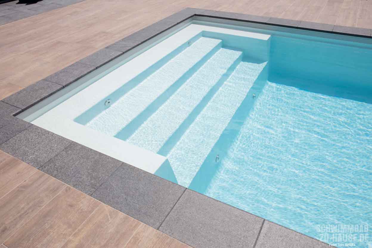 Passend zur cleanen und geradlinigen Architektur des Hauses entschied man sich – in enger Zusammenarbeit mit den Bauherren – für ein Fertigbecken der Firma Riviera Pool. Das gewählte Model „Linear“ in der Farbe „Papyrus“ mit den Maßen 10,45 x 3,70 x 1,50 Meter wirkt elegant und greift die Linearität der Umgebung harmonisch auf. „Mit der Wahl des Beckens wird die doch sehr cleane Optik des Wohnhauses perfekt widergespiegelt und der Pool, das neue Zentrum dieses Gartens, fügt sich perfekt in das Gesamtbild ein“, freut sich Bergmann. Für ein natürliches, warmes Flair zieren großformatige Fliesen in Holzoptik die Poolumgebung. Hier ist zudem ausreichend Platz für Sonnenliegen und gemütliche Loungemöbel zum Relaxen. An der dem Haus zugewandten Stirnseite des Schwimmbads dient eine breite Treppe nicht nur zum Einstieg, sondern bietet zudem eine gemütliche, sonnige Sitzgelegenheit zwischen den Schwimmeinheiten. Stichwort Schwimmtraining: Vor allem die Eltern nutzen die in das Becken verbaute leistungsstarke Gegenstromanlage für ihr tägliches Sportprogramm.