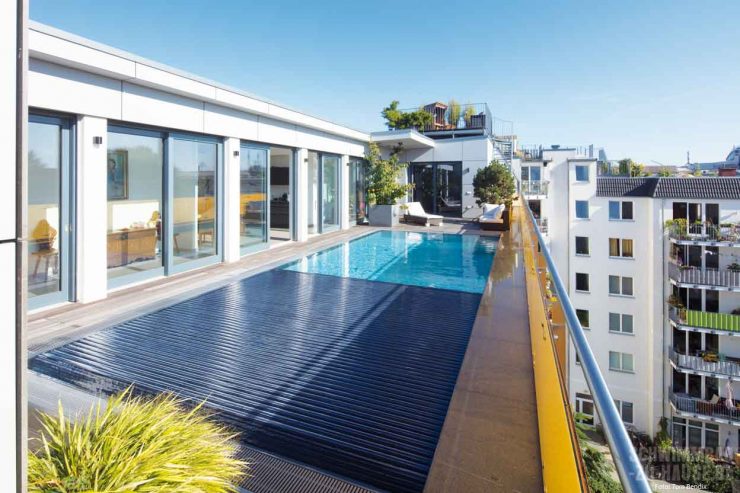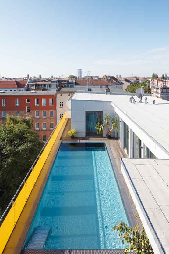 Das mit der Planung und Umsetzung beauftragte Architekturbüro entschied sich in Sachen Pool für Schwimmbecken-Rambow, ein Team aus Schwimmbadexperten, das bereits Erfahrung mit Projekten dieser Art sowie eine hohe Planungssicherheit vorweisen konnte. „Wir hatten sehr viel Spaß bei der Konzeption dieses High-End-Pools. Die Idee, die hinter dem Objekt stand, war ganz klar das Schaffen einer Ruheoase in der Großstadt-Betonwüste“, skizziert Jan Rambow die Aufgabe. Auf dem Dach des Berliner Wohnhauses entstand in enger Zusammenarbeit zwischen Bauherren, Architekten und Poolprofis ein Rückzugsort, der zum Abschalten und Entspannen einlädt.