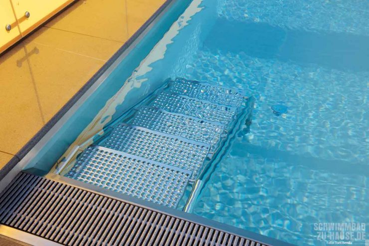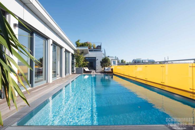 Mit seinen stattlichen Maßen von 10 x 4 x 1,5 Meter bietet der Pool mit hochwertiger, optisch eleganter Edelstahlrinne ausreichend Platz zum Schwimmen, Erfrischen oder einfach nur Planschen. Während des Schwimmens hält ein Sichtschutz aus gelb-orangenem Plexiglas unerwünschte Blicke ab. Dennoch können die Bauherren von der geräumigen Terrasse aus in exponierter Lage die atemberaubende Aussicht über Berlin genießen.