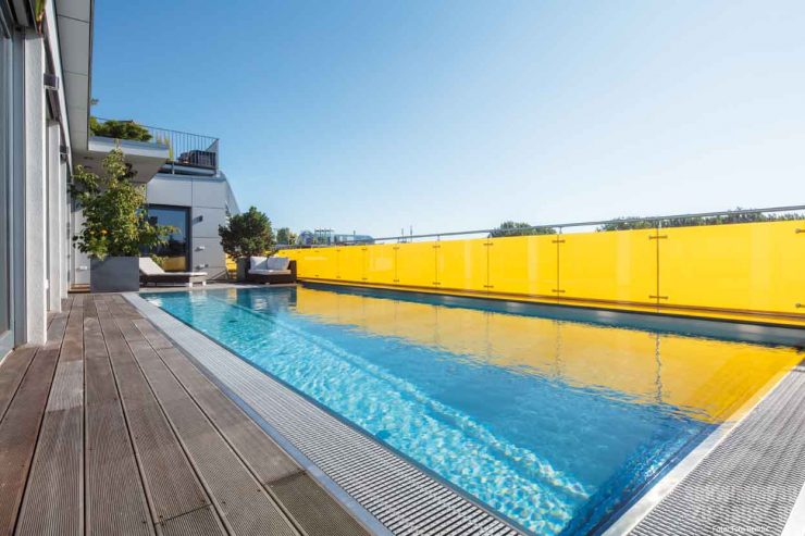 Über den Dächern der Stadt muss die Freiheit wohl grenzenlos sein … genau das wusste auch der Bauherr dieses Sonnenpools auf einer Wellness-Terrasse hoch über den Dächern Berlins. Seine Vorliebe für Rooftop-Pools steht außer Frage. Hat er doch bereits auf dem gegenüberliegenden Wohnblock ein vergleichbares Schwimmbadprojekt umsetzen lassen. Dieses Mal sollte jedoch eines anders sein: Das Schwimmbecken sollte zum einen größere Dimensionen aufweisen und zum anderen so positioniert werden, dass es in der Vormittagssonne liegt. Darüber hinaus befinden sich hier Wohn- und Wellnessbereich samt Pool, Erlebnisdusche und Sauna auf einer Etage, sodass eine harmonische Einheit zwischen Spa und Zuhause entsteht.