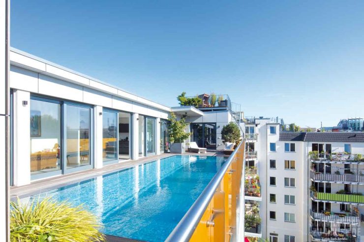Ein langes Becken, das bereits am Vormittag im Sonnenschein liegt, eine hochwertige Edelstahloptik und nicht zuletzt eine vollautomatisierte Schwimmbadtechnik – dies sind nur einige Highlights des hochwertigen Privat-Pools auf diesem Dach in Berlin-Friedrichshain. Als Ausgleich zum Trubel der Stadt bietet der Private Spa einen außergewöhnlichen Rückzugsort zum Energietanken und Entspannen.