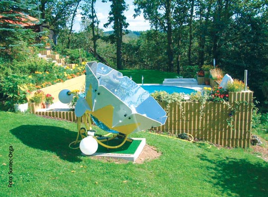 Wie ein Blütenkelch neigt sich dieses Sonnenenergie-Sammler-Modell der Sonne entgegen – und folgt ihr sogar. Die Spiegel auf der Innenseite der „Blätter“ leiten die Sonnenstrahlen an den in der Mitte angebrachten Absorber weiter, der die generierte Wärme wiederum an das Wasser in einem 135 Liter fassenden Pufferspeicher abgibt. Von dort aus wird das Wasser zurück in den Poolkreislauf eingespeist.