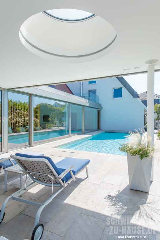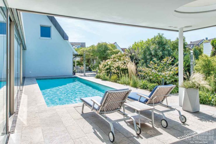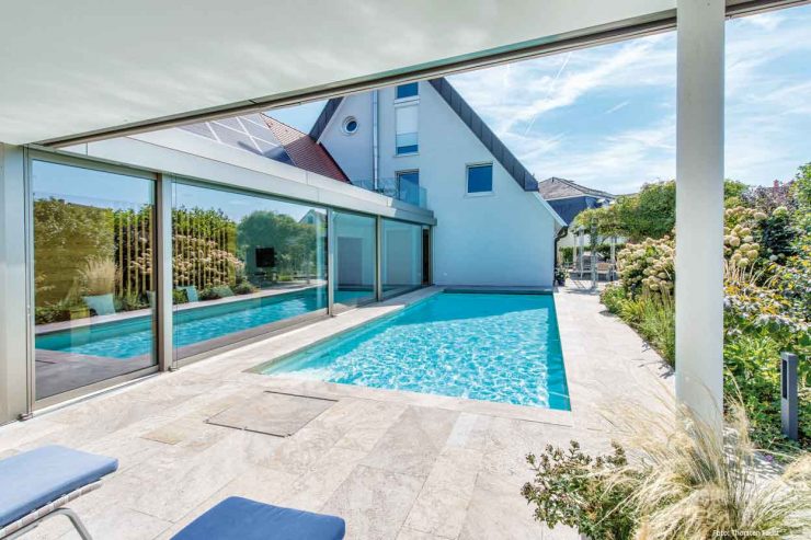 Fit und gesund bleiben bis ins hohe Alter – wer möchte das nicht? Um dies zu erreichen, sind eine gesunde Ernährung und viel Bewegung essenziell. Das wissen auch die Eigentümer dieses schönen Anwesens im Großraum Frankfurt, und sie haben sich daher ein Schwimmbad in den Garten gebaut. Doch nicht nur die Sportlichkeit, sondern auch Entspannung und Urlaub sollten mit diesem Projekt nach Hause gebracht werden, denn auch die seelische Gesundheit trägt zu einem hohen Alter bei.