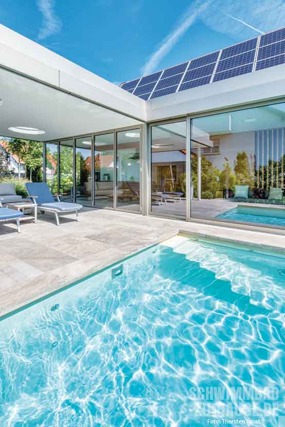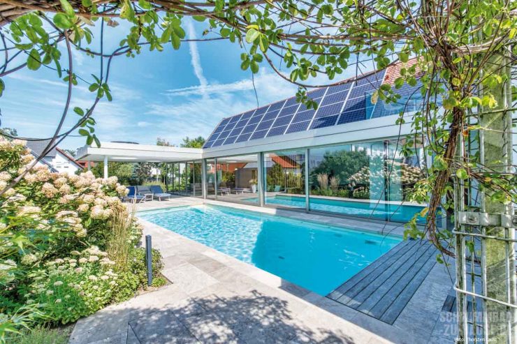 Auf dem Dach des Anbaus findet sich ein grünes Highlight: Die große Solaranlage, die unter anderem auch den Strom für die Wärmepumpe des Pools liefert. Zusammen mit der Rollenabdeckung wird so Energie gespart und den Bauherren ermöglicht, den Pool möglichst lange zu nutzen. Die Abdeckung von Rollo Solar wartet mit Spezial-Stützkonsolen für erhöhten Wasserstand auf und verschwindet, wenn nicht benötigt, unter der hölzernen Abdeckung, die farblich mit den Außenfliesen verschmilzt. Doch nicht nur die Abdeckung spart Energie, sondern auch die Pooltechnik. Über die Steuerung Euromatik.net wird die Pumpendrehzahl reduziert, sobald der Rollo zugemacht wird, und die Eco-Filterpumpe verfügt über eine Drehzahlregelung. „Die technische Ausstattung des Pools sollte übersichtlich und leicht zu bedienen sein“, so der Bauherr. Eingerahmt wird der Garten durch die prachtvolle Bepflanzung mit Hortensien, Gräsern und Hecken, die einen schönen Sichtschutz bietet. So ist der Pool von außen nicht einzusehen. Flankiert wird das 10 x 4 x 1,5 Meter große Becken von einer Kalt- und Warmwasserdusche der Firma Ideal Eichenwald.